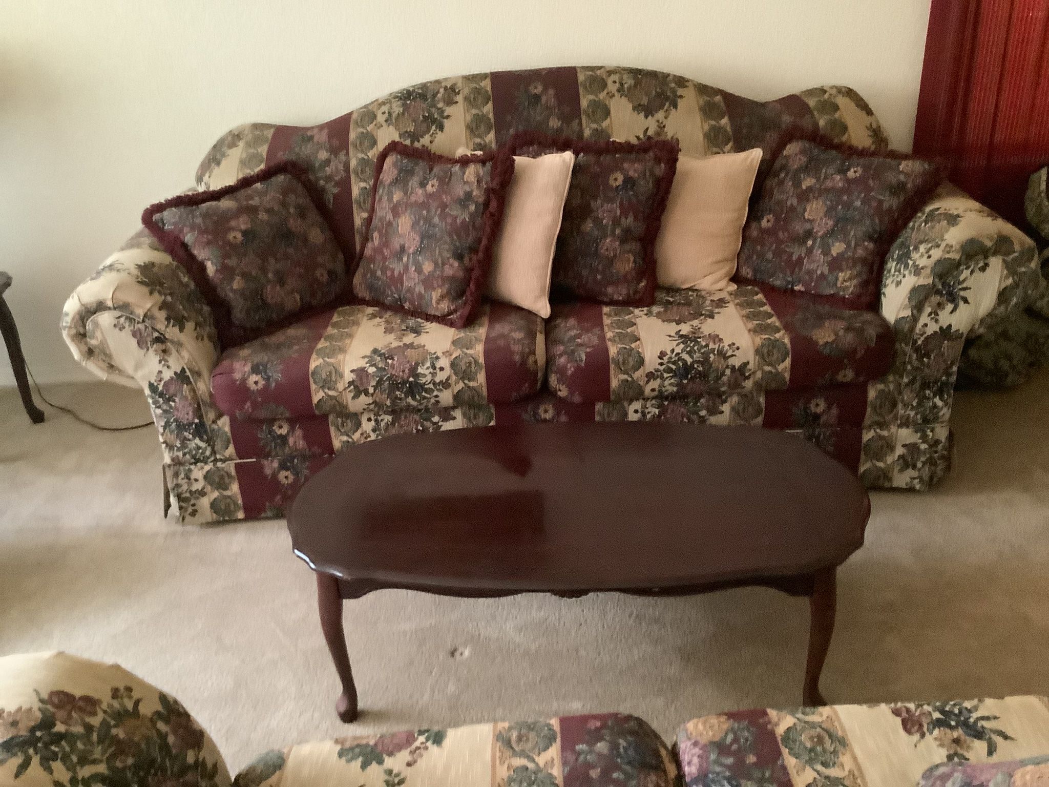 Couch 93” long 39” height and 37” wide; Love seat 69” long, 36” height and 37” wide; Chair 47” long, 36” heights and 37” wide; Coffee Table 45” long, 24” wide; End Tables 20” height, 10 1/2” wide; Lamps 30” height and base 6” wide