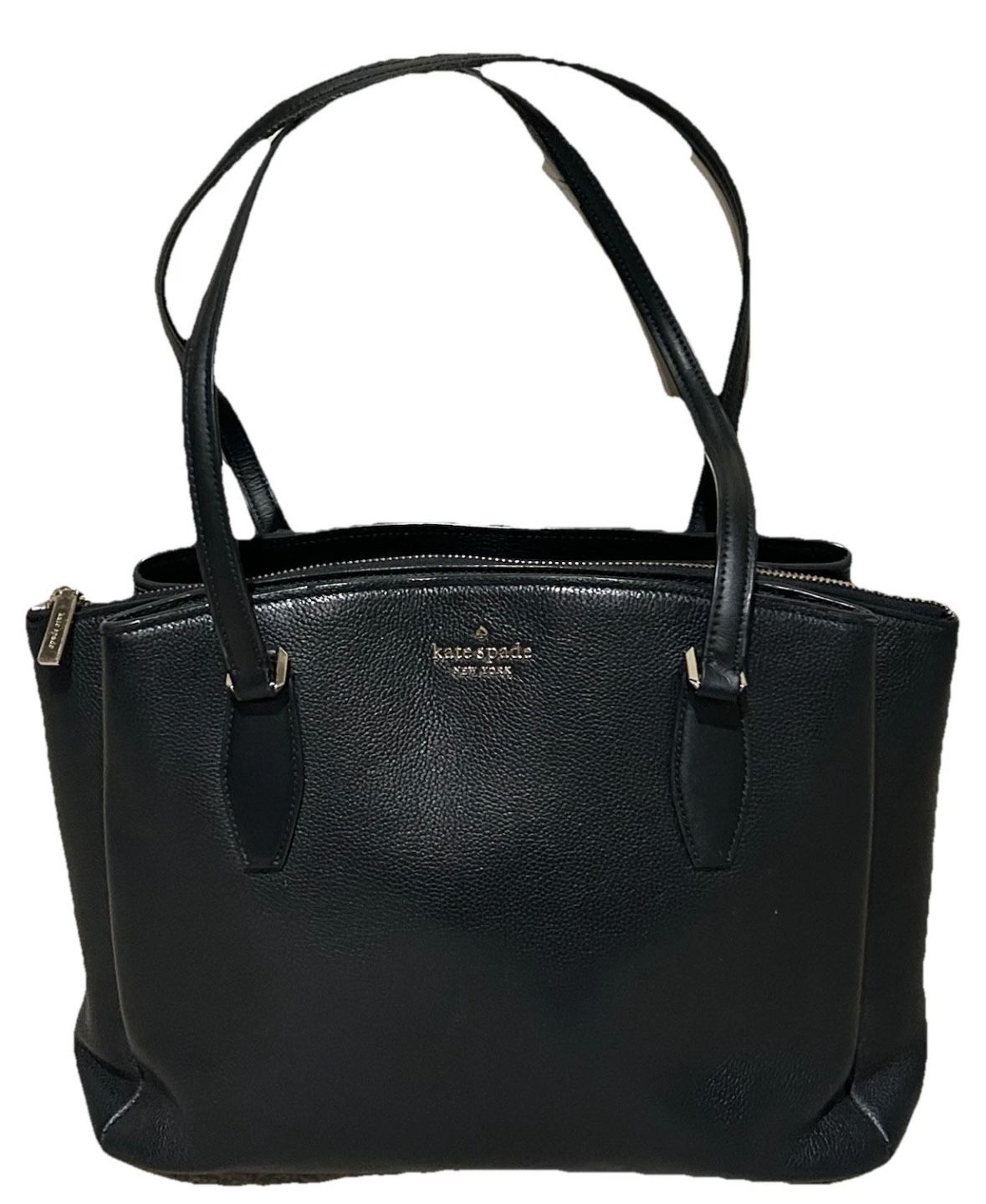 Kate Spade New York Madison Tote / Shoulder Bag Purse. Gold accents. 3 large pockets, several small slip pockets. Kate spade lining. Kate Spade emblem on the outside. Light peeling on the strips but not noticeable. Super clean. Used on some work trips but don’t travel much anymore so no longer need it. Size: approx. 15" x 11" x 5" Color: Black Material: Leather ~ All items are 100% guaranteed authentic & ship from a SMOKE-FREE home. ~ Items are measured lying flat, un-stretched.