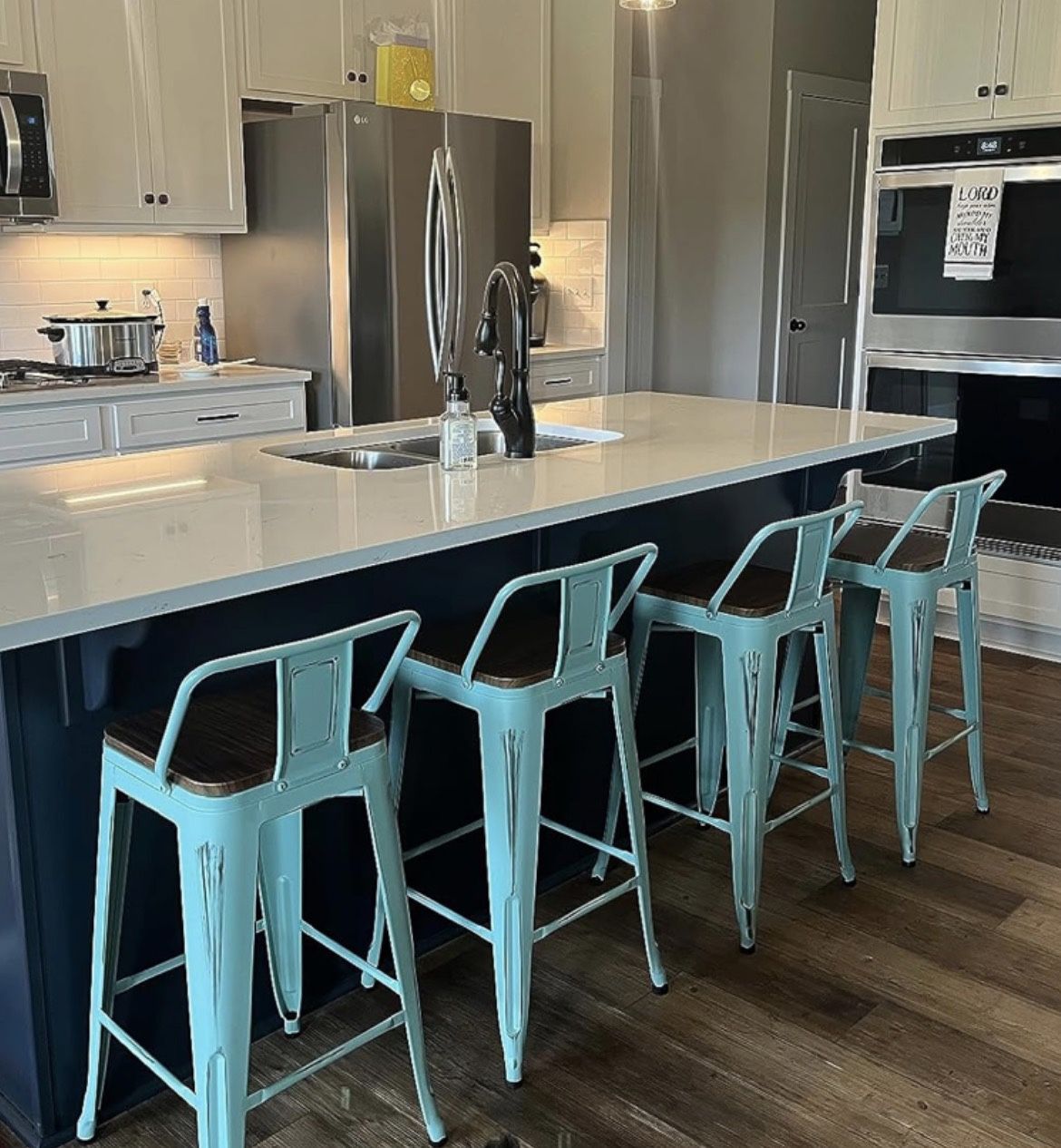 Set Of 4, 30in Distressed Mint Green Metal Barstools With Wooden Seat & Low Back