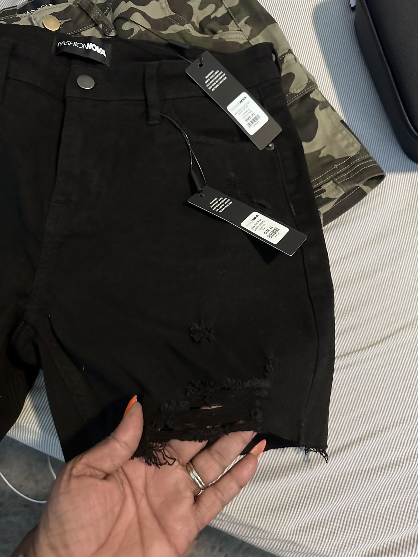 There to pair a Fashion Nova shorts size extra large fit like a large brand new tag still on one pair of army fatigue one black pair, distressed very nice shorts