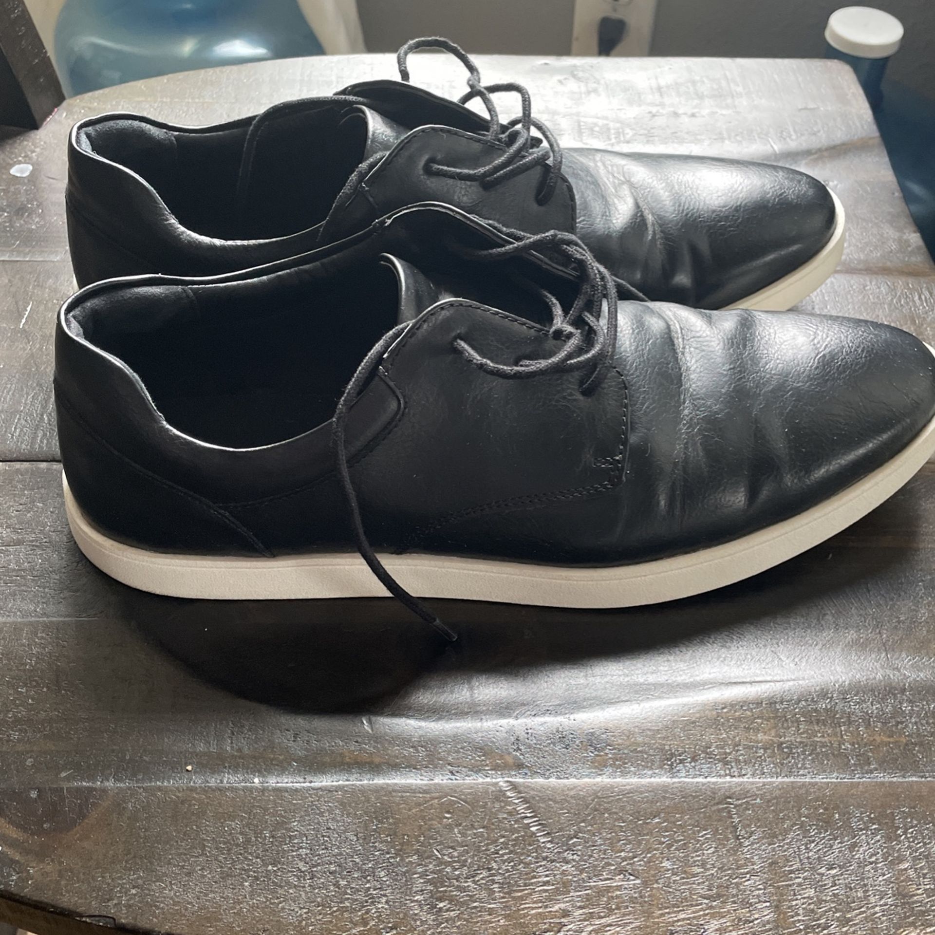 Men Alfani dress sneaker in size 11.5 but it runs a bit bigger. I am usually a 12 in sneakers but with these, the 11.5 fit well. They’re black with a white sole. No scratches or tears. Must see.