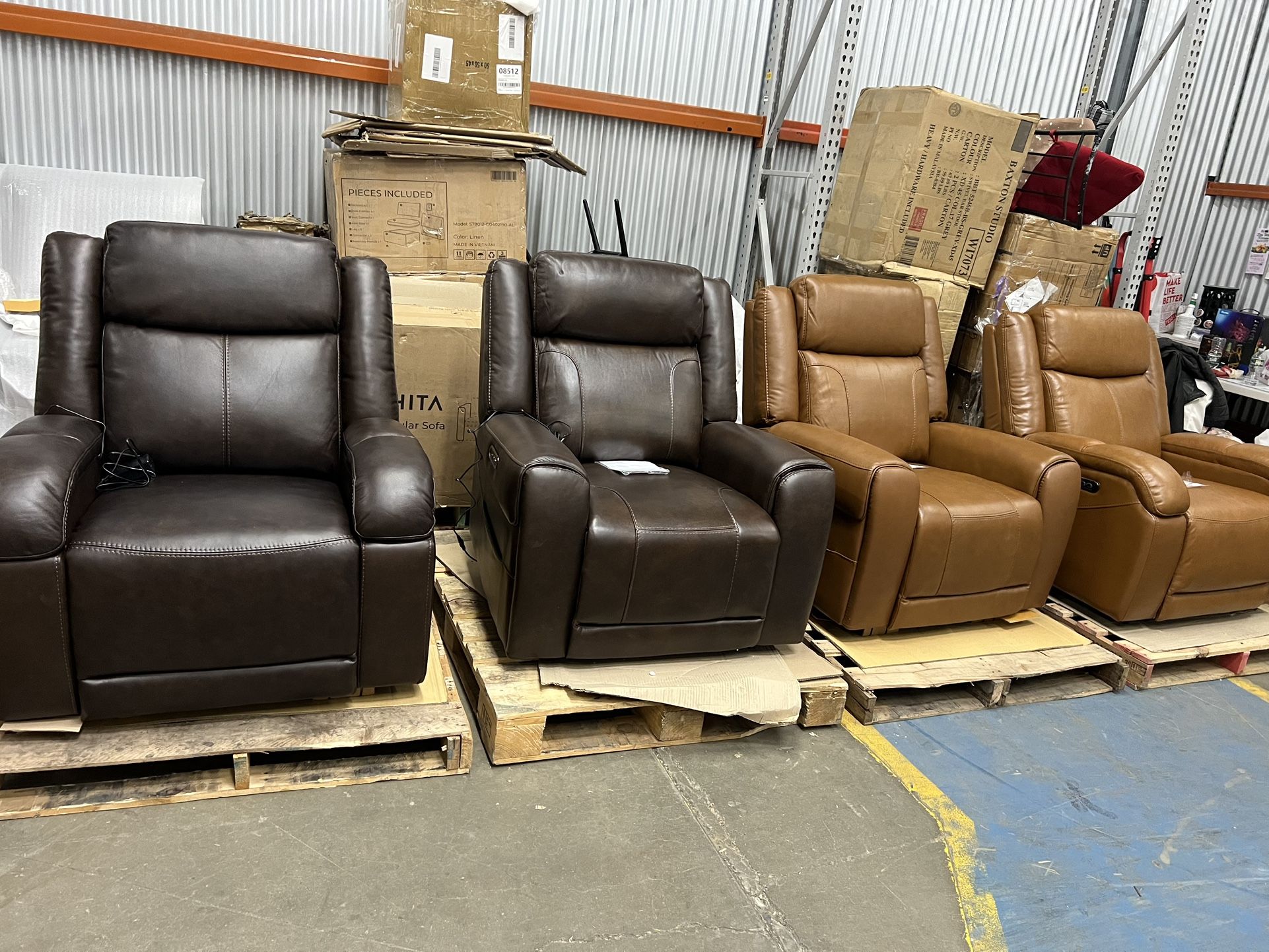 Product: Isaac Genuine Leather Wall Hugger Power Recliner with Power Headrest Color: Saddle / Brown Price: $295 each, Buy 2 for $580 Condition: Genuine leather power recliner Features: • Power reclining + power headrest • Wall-hugger design (only needs about 3 inches from the wall to recline) • Built-in USB & Type-C charging ports Pickup location: Kearny, NJ 07032 Sold 1 Saddle Brown chair .