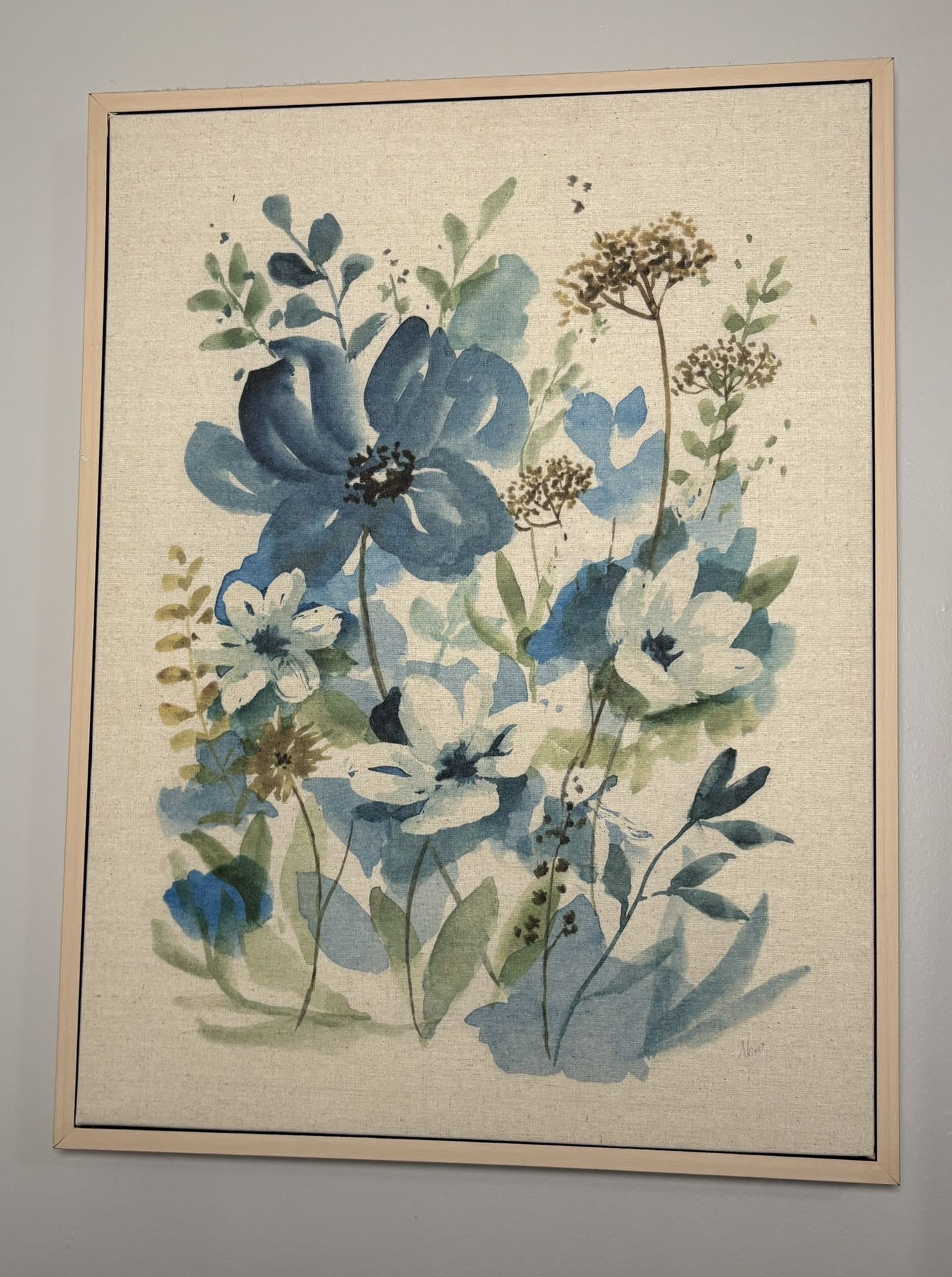 Beautiful large floral wall art featuring soft blue watercolor-style flowers on a neutral background. Framed canvas design gives it a clean, modern look that works well with farmhouse, coastal, contemporary, or minimalist decor styles. Perfect statement piece for living rooms, bedrooms, dining areas, or entryways. Lightweight and easy to hang, adds a calm and elegant touch to any space. Selling as is and open to negotiations!