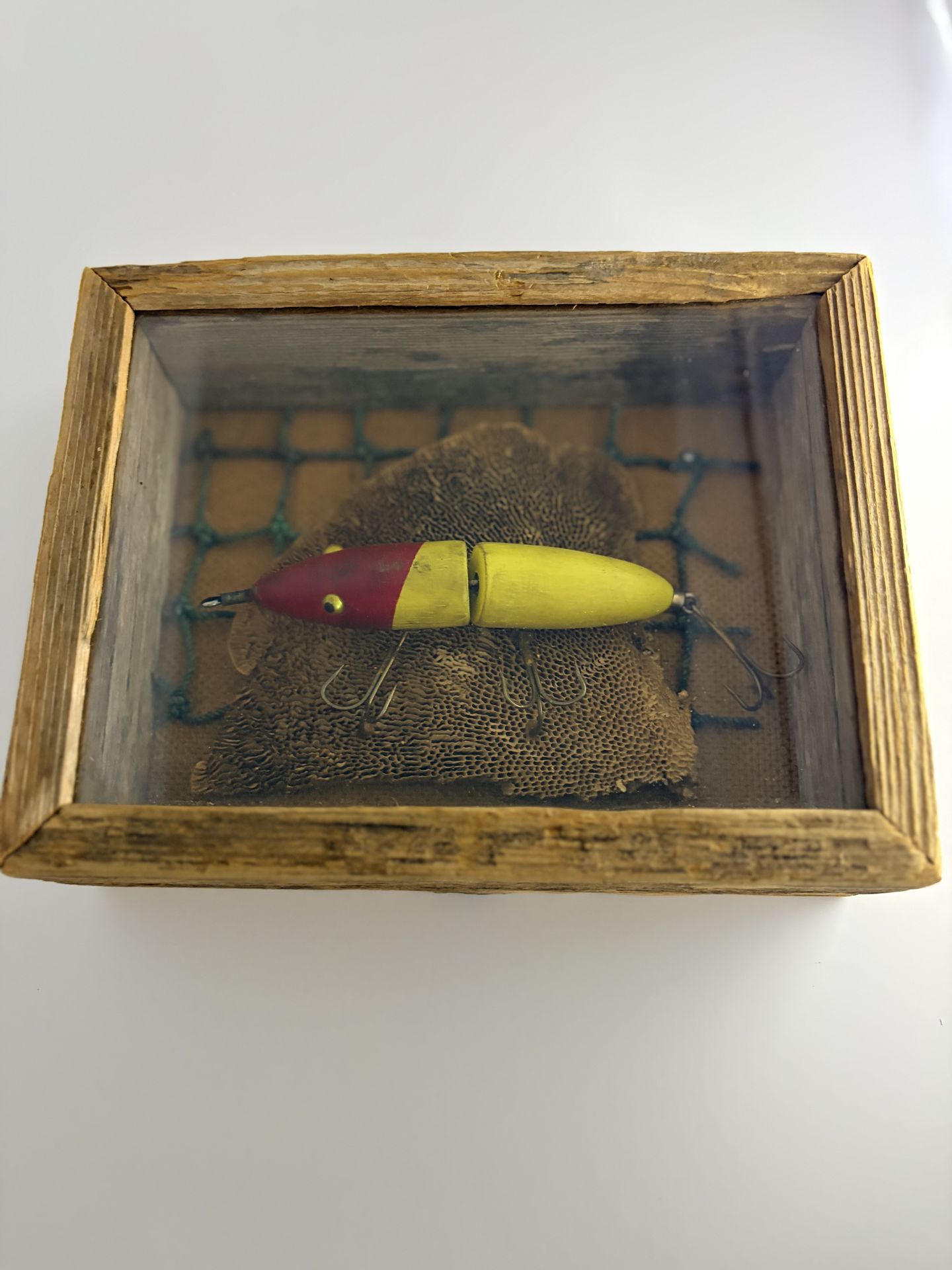 A decorative shadowbox featuring a vintage jointed wooden fishing lure. 6.5 T 8 W 2.5 D