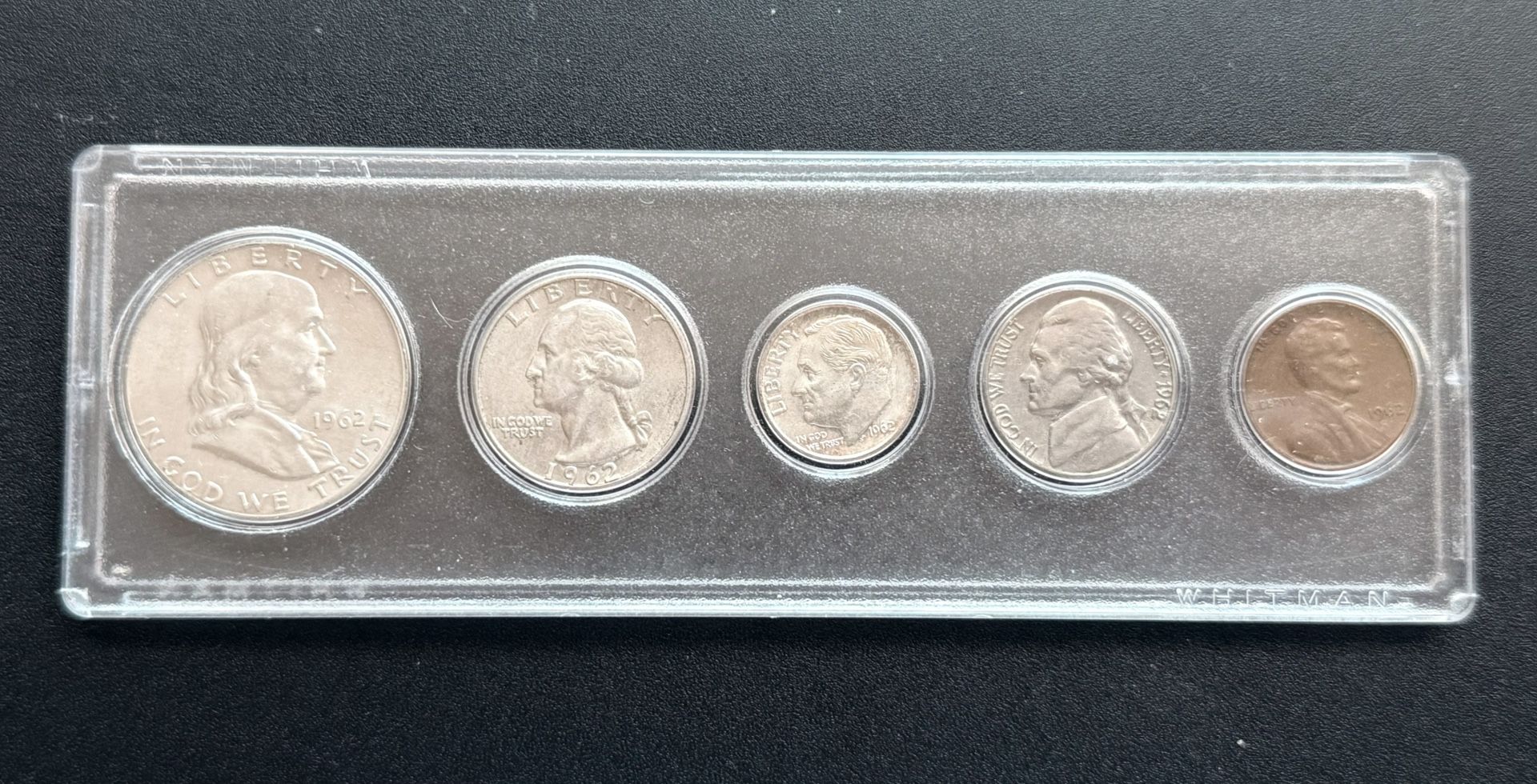 This is a set of lightly circulated coins from the year 1962. The coins in this set are better than average circulated with some coins still showing mint luster. The half dollar, quarter and dime are 90% silver.