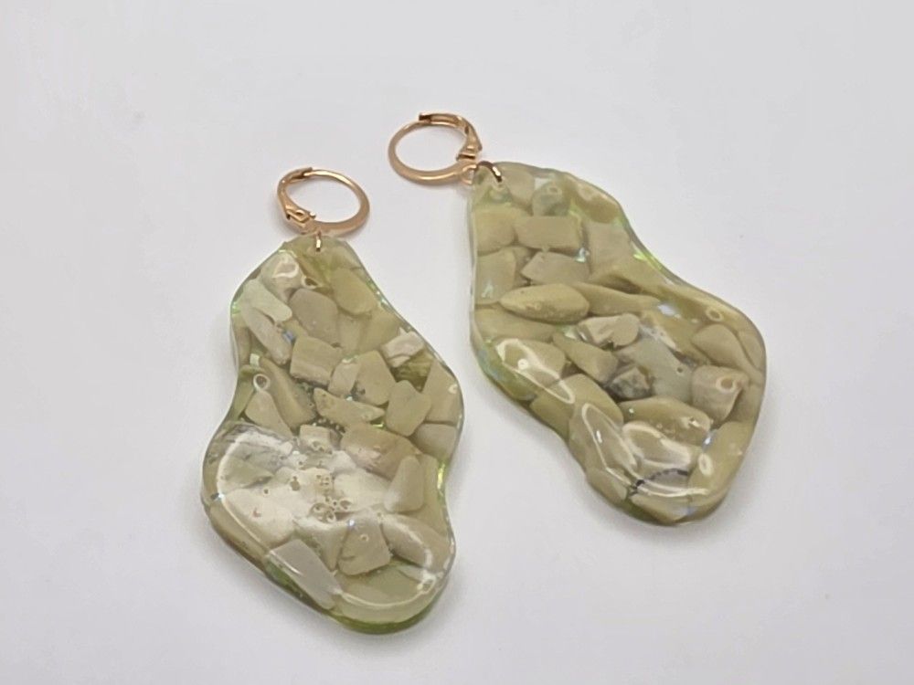 Chips of Serpentine encased in resin, set on pale gold leverbacks