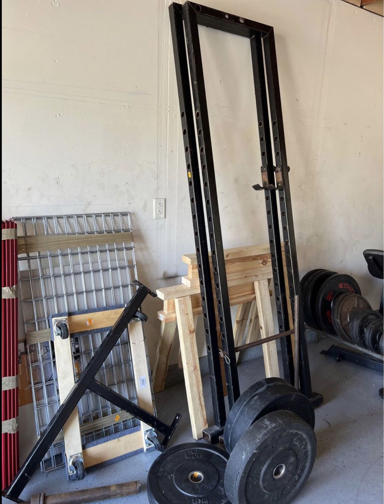 Located in San Marcos for pick up! Connect with smaller bar and can attach to wall if you prefer a very firm rack! Ignore: gym Weights barbell curl bar ez bench press pesas mancuernas home gym