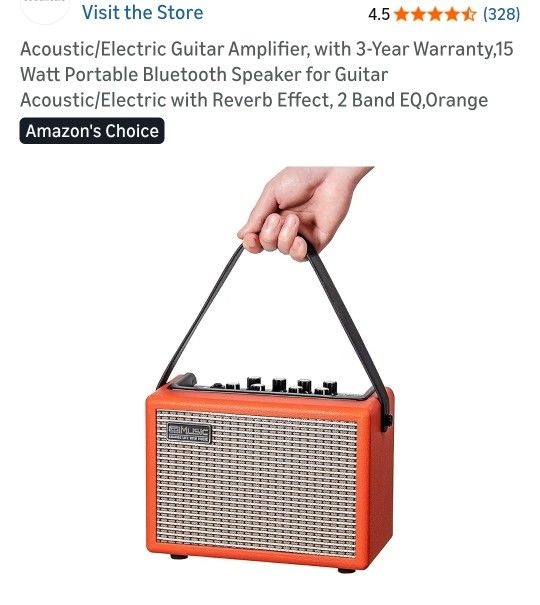 New in box. Currently $86 plus tax on Amazon. Acoustic/Electric Guitar Amplifier,15 Watt Portable Bluetooth Speaker for Guitar Acoustic/Electric with Reverb Effect, 2 Band EQ,Orange 【15-Watt】15-Watt Guitar Amplifier that provides explosive tone with super portable size. 【3 Inputs】Electric guitar input with distortion effect, acoustic guitar input with reverb, alao with AUX in, which will bring you a great sound feast 【Bluetooth】You can use your phone or I pad to play background music for your workout. 【Portable】: With delicate wooden shell and compact size design, the guitar amplifier can be easily carried anywhere via the strap, which makes it quite suitable for travel use. 【Rechargeable】It can run up to 5-8 hours depends on the volume you use after 5 hours charge. And it can work with a connection directly to the electricity.
