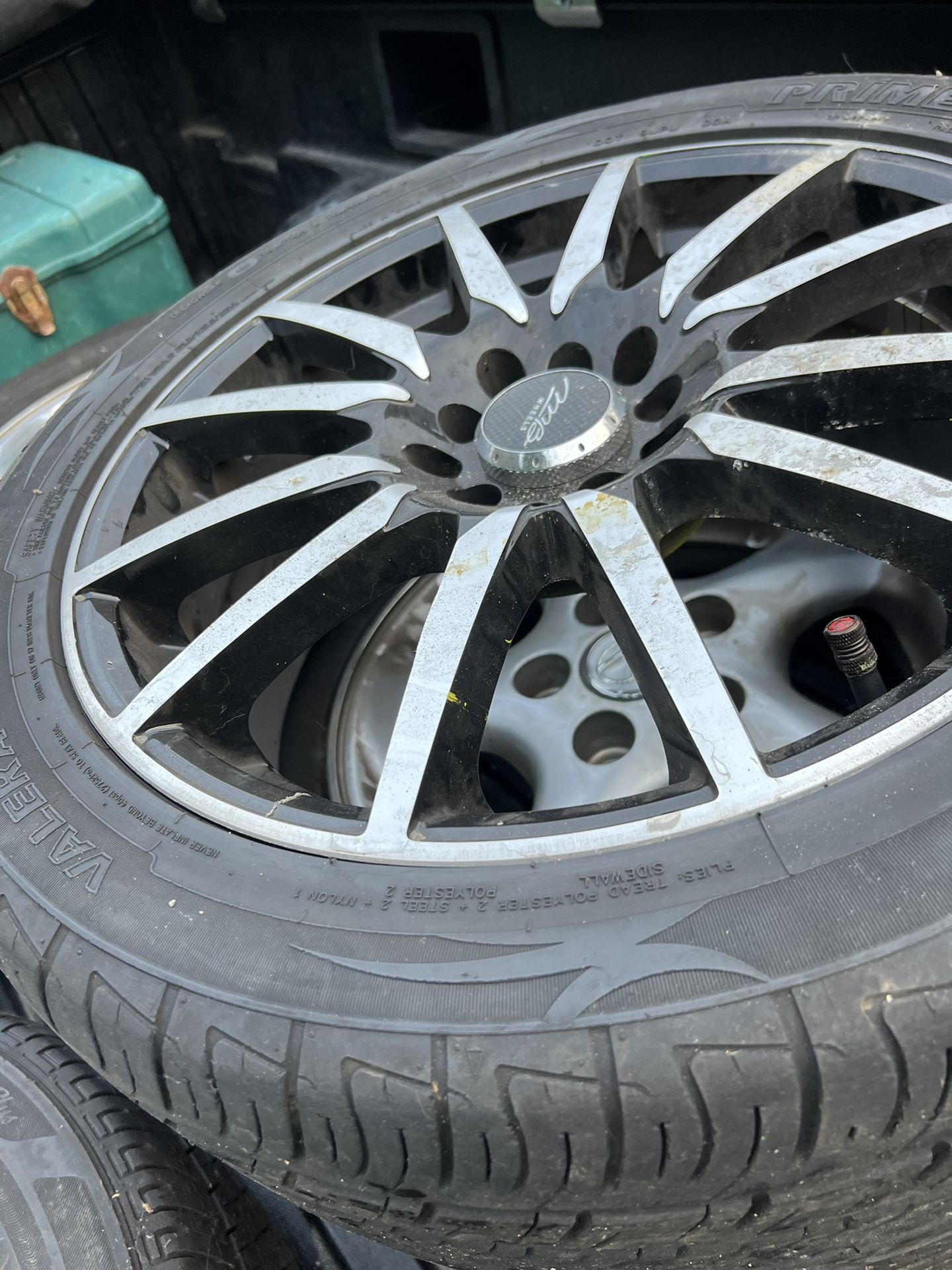 MB Wheels 17x7 Wheel Rim 17" 12 Spoke. Some scrapes but can be cleaned up to look nice. Universal bolt. Primewell Valera Sport AS tires that have tread.