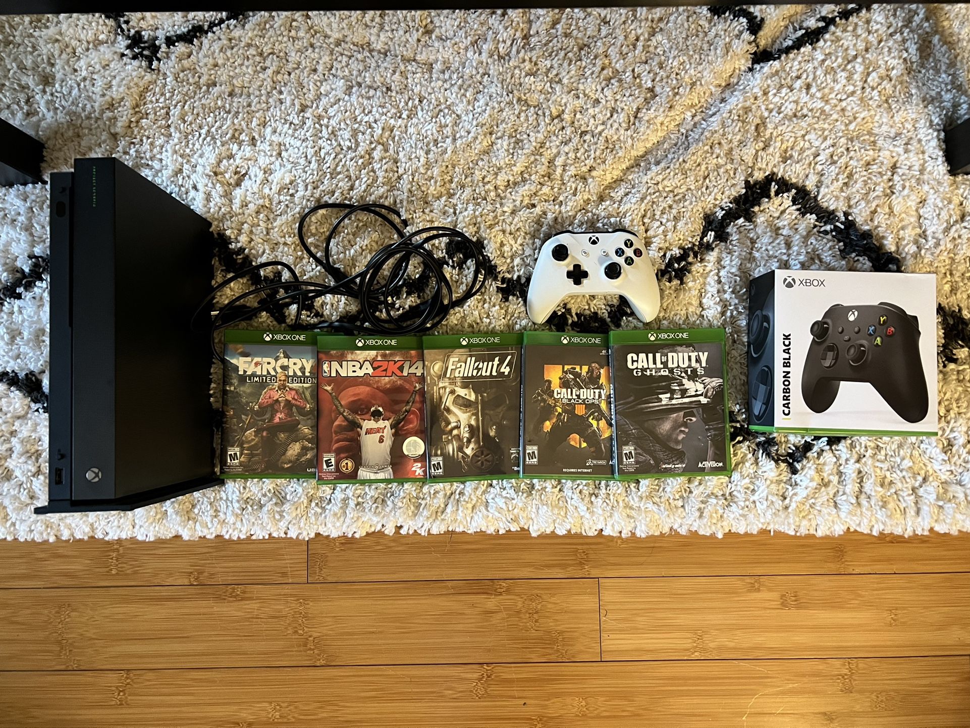 This bundle includes: -Xbox One X Scorpio Edition (day 1); 500gb HDD. Runs perfectly. I just upgraded to the Series X, so I no longer need it. -all cords. + -1x brand new (unopened) Carbon Black controller -1x xbox controller -Fallout 4 -Farcry 4 -Call of Duty Ghosts -Call of Duty Black Ops III -NBA 2K14 Everything is in great condition, regularly cleaned, and all adult owned. No scams; crypto accepted. Keywords: Xbox one x, xbox one, carbon black Xbox