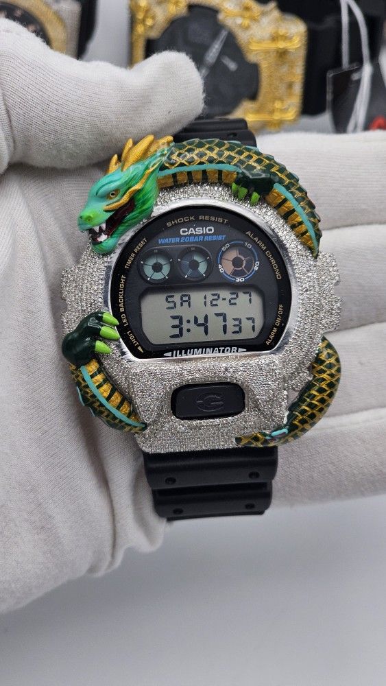 This custom G-Shock is fully flooded with natural diamonds, delivering intense sparkle and a truly premium finish. Expertly crafted with a solid 925 sterling silver bezel, precision-set to enhance brilliance and durability. Each diamond is hand-selected and professionally set for maximum shine and long-lasting quality. Built on an authentic Casio G-Shock, engineered for shock resistance and everyday performance. The perfect fusion of luxury craftsmanship and rugged street style. A bold statement timepiece designed for those who demand real diamonds and real presence.