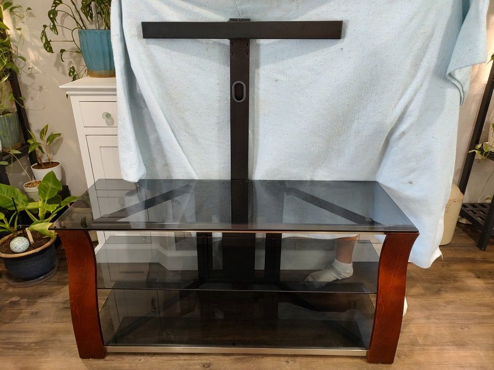 Bell'O Triple Play TV Stand. Pamari Collection. Supports up to 55" TV. It has a swiveling bracket, cable management system to hide cords, three tempered smokey glass shelves, brushed nickel and black metal and solid wood brown supports. The stand is 50" wide x 17.5" deep x 24" tall. The TV mount is 50.5" tall. Can mount the TV or just put it on top of the glass stand. The mounts are brand new...never been used. The shelves come off for transport. In like new condition. In Holiday.