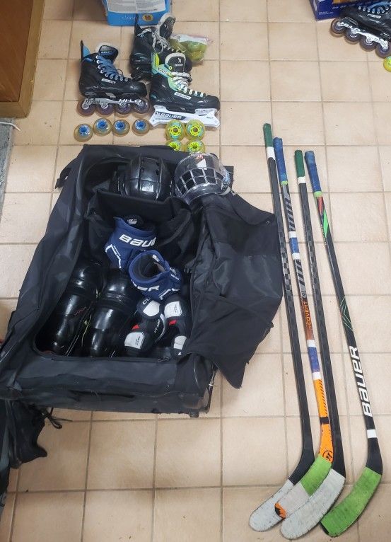 Come with: -bag -shinpads -elbow pads -gloves -helmet -bubble -Skates** -one of the sticks on the right* *If you want more then 1 stick it will be $50 more More details on my profile **any for skate size message me and the wheels for the skates are next to the skates and each skate is a different price Feel free to message me for any questions and I will give a response within 24 hours and price is not exact I will change it depending what you get and I'm not firm on prices
