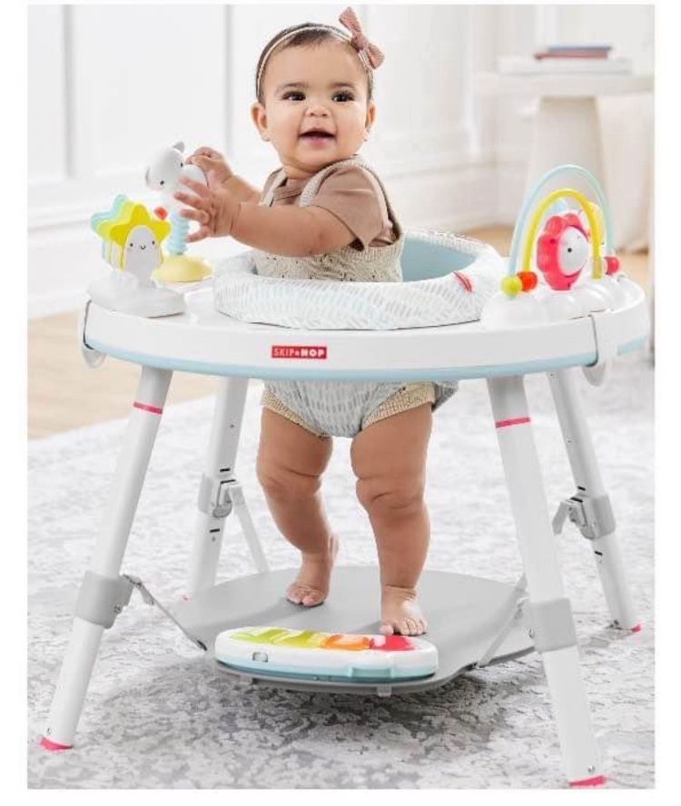 Baby Activity Center: Interactive Play Center with 3-Stage Grow-with-Me Functionality, 4mo+, New in Box Designed to grow with baby in three stages, Silver Lining Cloud Baby's View Activity Center is an action-packed take on our best-selling gym. Featuring the same developmental approach to play and learning as our Explore & More™ version, the décor-friendly design features a 360-degree rotating seat that turns and stretches for bouncing. Our unique Discovery Window gives little ones a clear view of their feet as they play the light-up piano to connect cause and effect. Four dreamy toys can be rearranged for customized play. As baby grows, the activity center converts for easy cruising. At stage three, it transforms into a sturdy toddler table with a plastic chalkboard surface for drawing, playing-the sky's the limit!.