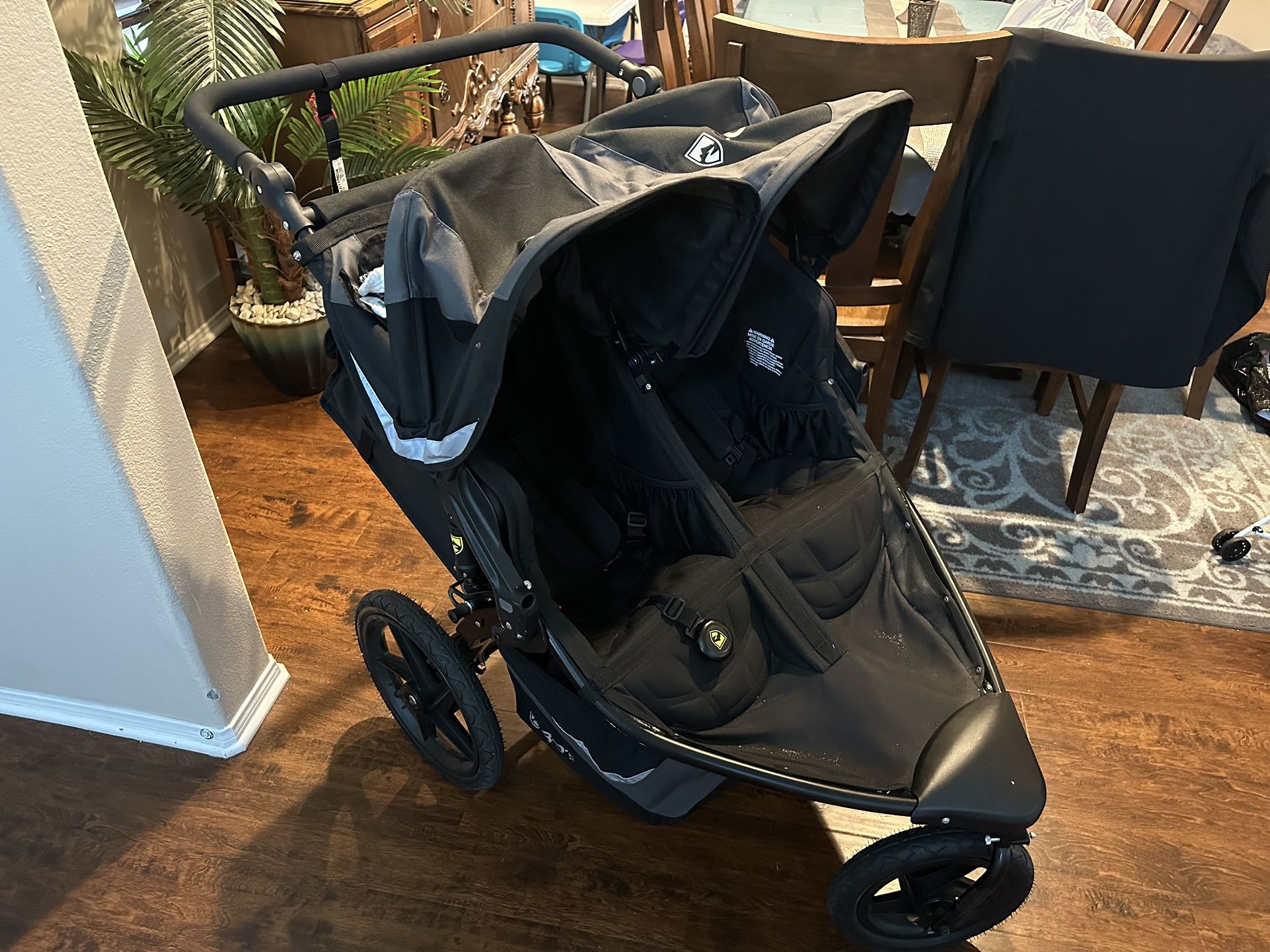 Side-by-side seats. Foldable shades. Storage area under seats, which is good for carrying diaper bags, blankets, toys, etc. Used