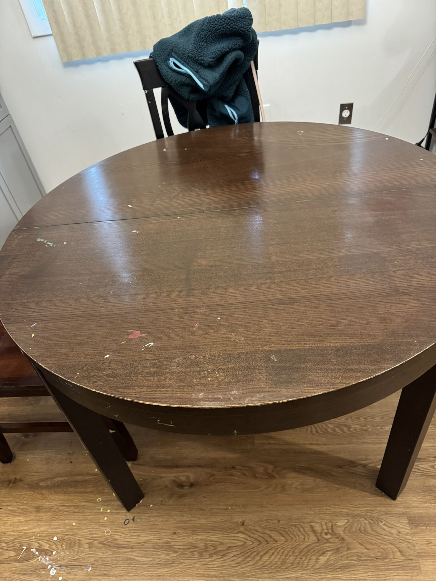 Well loved dining room table. It’s a circular table that can expand to an oval. The expansion panel is tucked inside. This listing is only for the table. Must be moved when picked up. It’s heavy and will require 2 people and a truck. I’m unable to help in moving it. Pickup in Petersburg. Cash. Would like to have it gone by Friday 10/17
