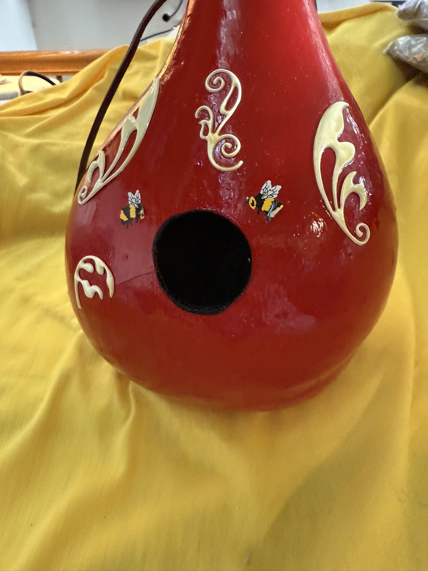 New .. Stunning … h Hand .. Painted .. Gourd … Pretty … Red / White … with Leather hanging Cord .. Great … Home … Decor … inside .. Or … Out .. If choose use outside for … Birds to use .. ( To have there babies ) .. Or .. Just keep .. Inside .. Hang .. At .. Window .. or .. Somewhere else . .. Would .. be .. Pretty .. Anywhere .. .. Used .. a very … Short.. Time .. Inside … But still new .. .. Bought .. .. Out of town … Wasn’t .. That … cheap ! .. Make … Great … gift ,.. Too … For the person. … that has … Everything .. … Anyone … Would … love .. Questions … Ask …. Shipping .. … Available Cash … Only ! Pickup SALEM , VA