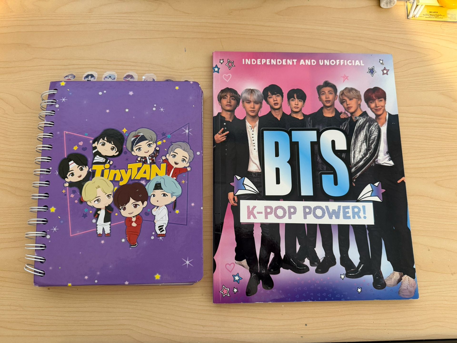 BTS Tiny Tan notebook with dividers and BTS magazine with pictures and fun facts about BTS Kpop group. Perfect as a gift for someone who loves BTS. Open but in like new condition