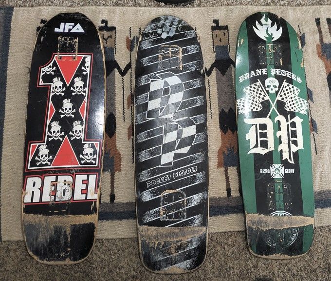 Selling three original Duane Peters pro model decks from Black Label, Pocket Pistols, and Emergency. All are well‑ridden but straight, solid, and perfect for cruising, pool riding, or wall display. Classic punk‑influenced graphics from one of skateboarding’s most iconic anti‑heroes. 🔥 Decks Available 1) Duane Peters Emergency “Rebel / #1 Skull” Model – $50 Iconic #1 graphic filled with repeating skull‑and‑top‑hat pattern. “REBEL” lettering across the bottom. Heavy cosmetic wear but no cracks or delam. Measures 32-1/2" x 9-3/8" w/ 15-3/8" wheelbase 2) Duane Peters Black Label “Death & Glory / Torch” – $50 Green/black stripes with torch graphic. Measures 33-1/2" x 9-3/4" w/ 16" wheelbase 3) Duane Peters Pocket Pistols Deck – $50 Bold black/white graphic with DP signature. Measures 33-3/4" x 9-3/4" w/ 16-1/4" wheelbase 💥 Bundle Deal Take all three for $140 OBO ✨ Condition • All decks show minor tail wear and scuffs • No cracks or delamination • Great for riders, collectors, or wall art 📍 Pickup in Shoreline / North Seattle Cash or Zelle preferred. All reasonable offers considered. More photos available on request.