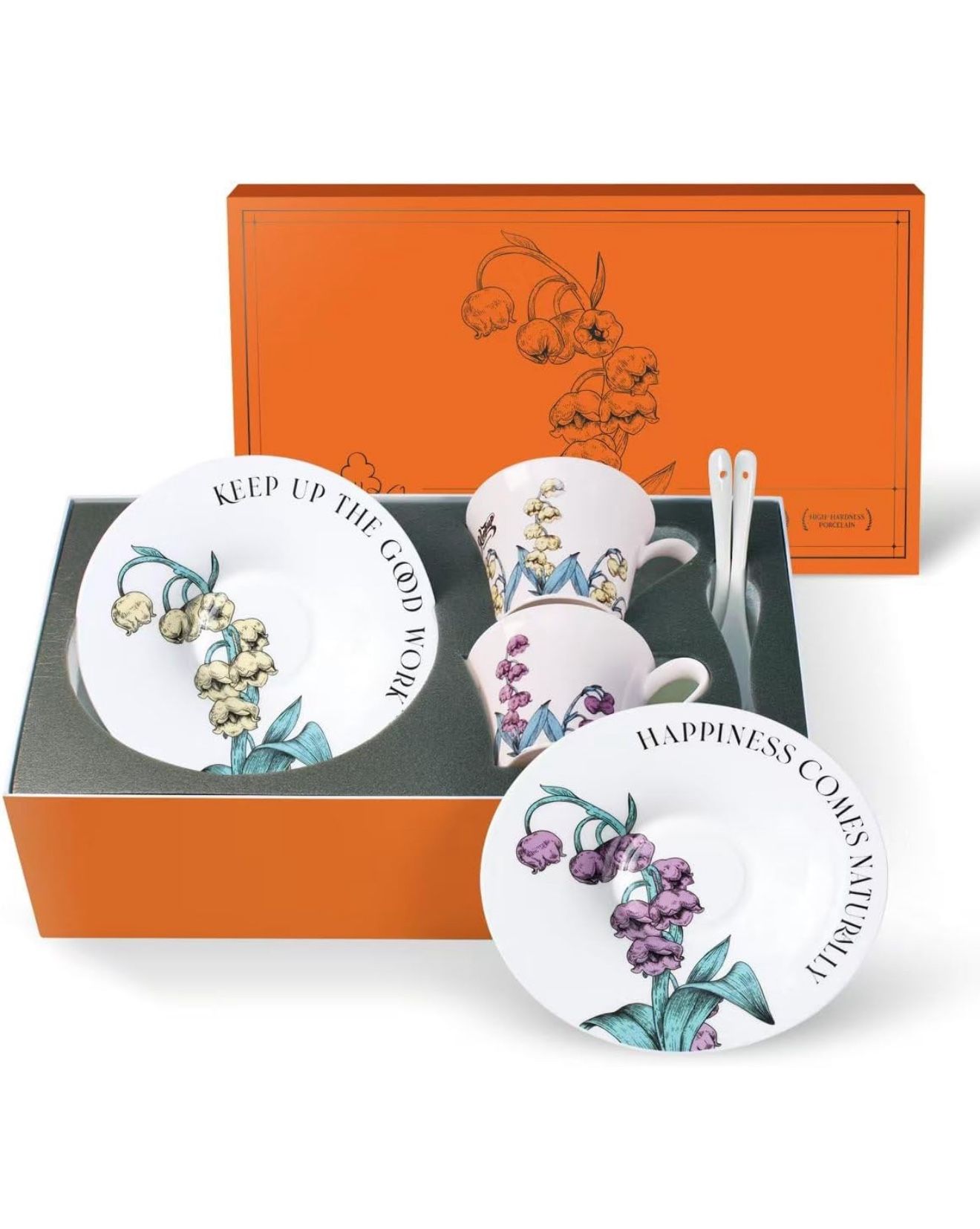 THigh-quality materials:Tea cup made of high-quality ceramic materials, it is durable, thin and translucent, and does not contain harmful substances such as lead and cadmium, ensuring the safety of your drinks. Tea tup Set packaging:vintage tea cups set contains two coffee mugs, two saucers, two spoons, the outer box packaging is very exquisite, it is an ideal choice for elders and friends. Suitable for birthdays, holidays, weddings, anniversaries, or as gifts for employees. Unique and creative design: The designer uses the lily of the valley flower pattern design, which means the return of happiness, the tea cups pattern is exquisite, each cup has a capacity of 7 ounces, with a spoon, easily stirred, and enjoy a leisurely time. Easy to use and clean: Whether it is hot tea, hot coffee, or cold drinks, it can be heated in the microwave or washed in the dishwasher, saving time and effort, and convenient for your use Provide satisfactory service: We are committed to providing you with high-quality china ceramic tea cup set products and a satisfactory shopping experience, if you are not satisfied with any products, please feel free to contact us, we will provide you with a satisfactory solution!