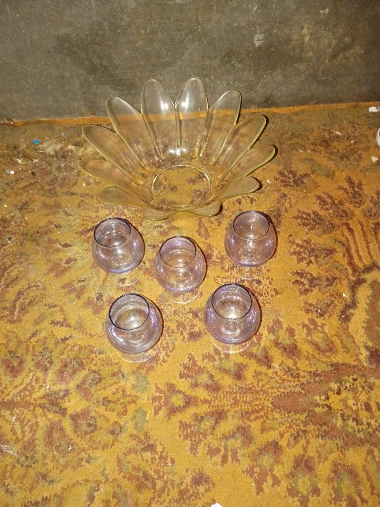 5 little glasses and sunflower bowl ,, mint condition