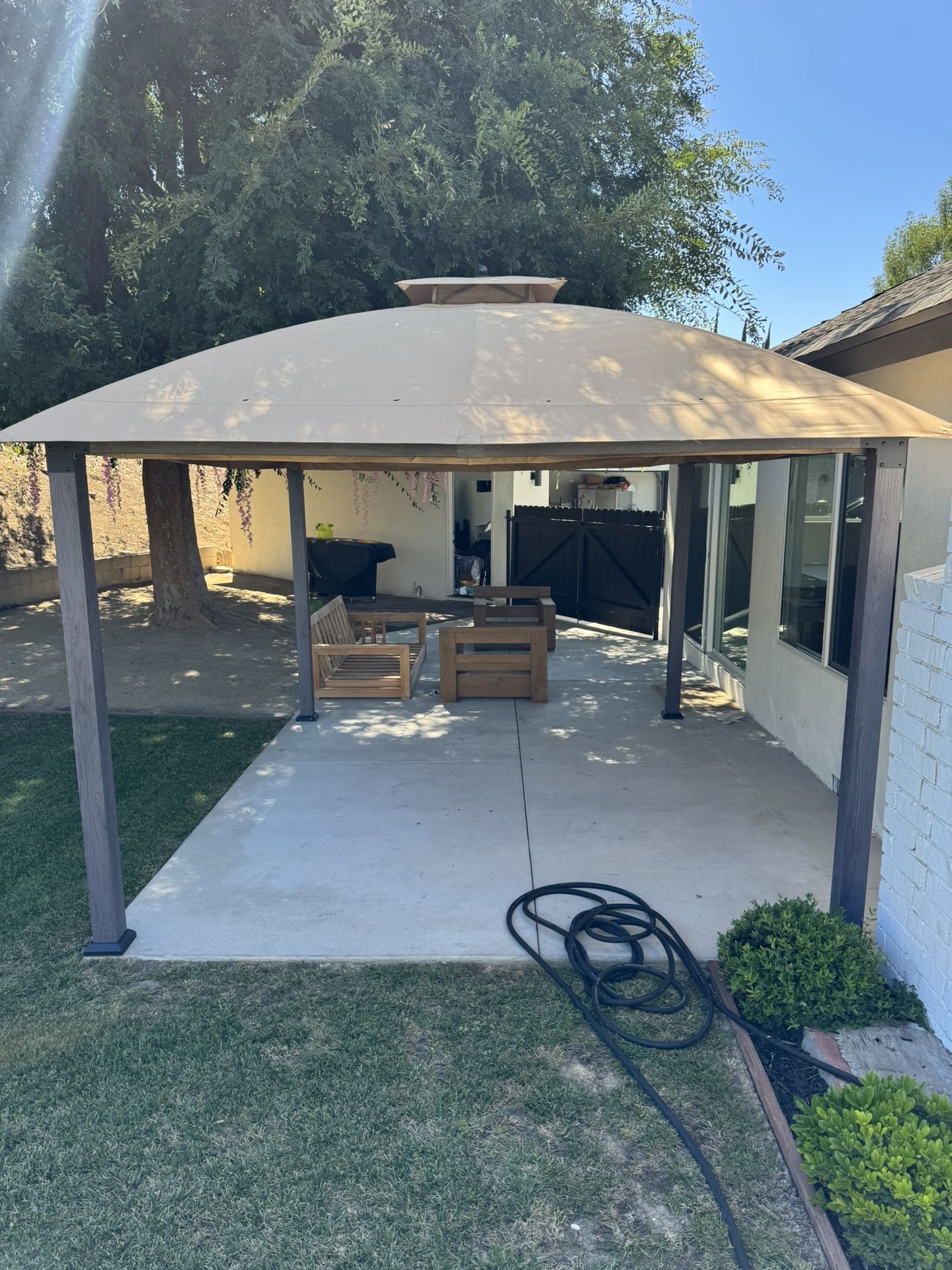 Available don’t ask. Pick up Imperial/santa Gertrudes Brand new cover. Just put on for pictures. It’s 10x12 feet around The posts are 6feet 9inches tall From the ground to the middle top of the canopy the height is 9 feet 6 inches. Structure is like new from Broyhill You can attach lights around the sides of gazebo.