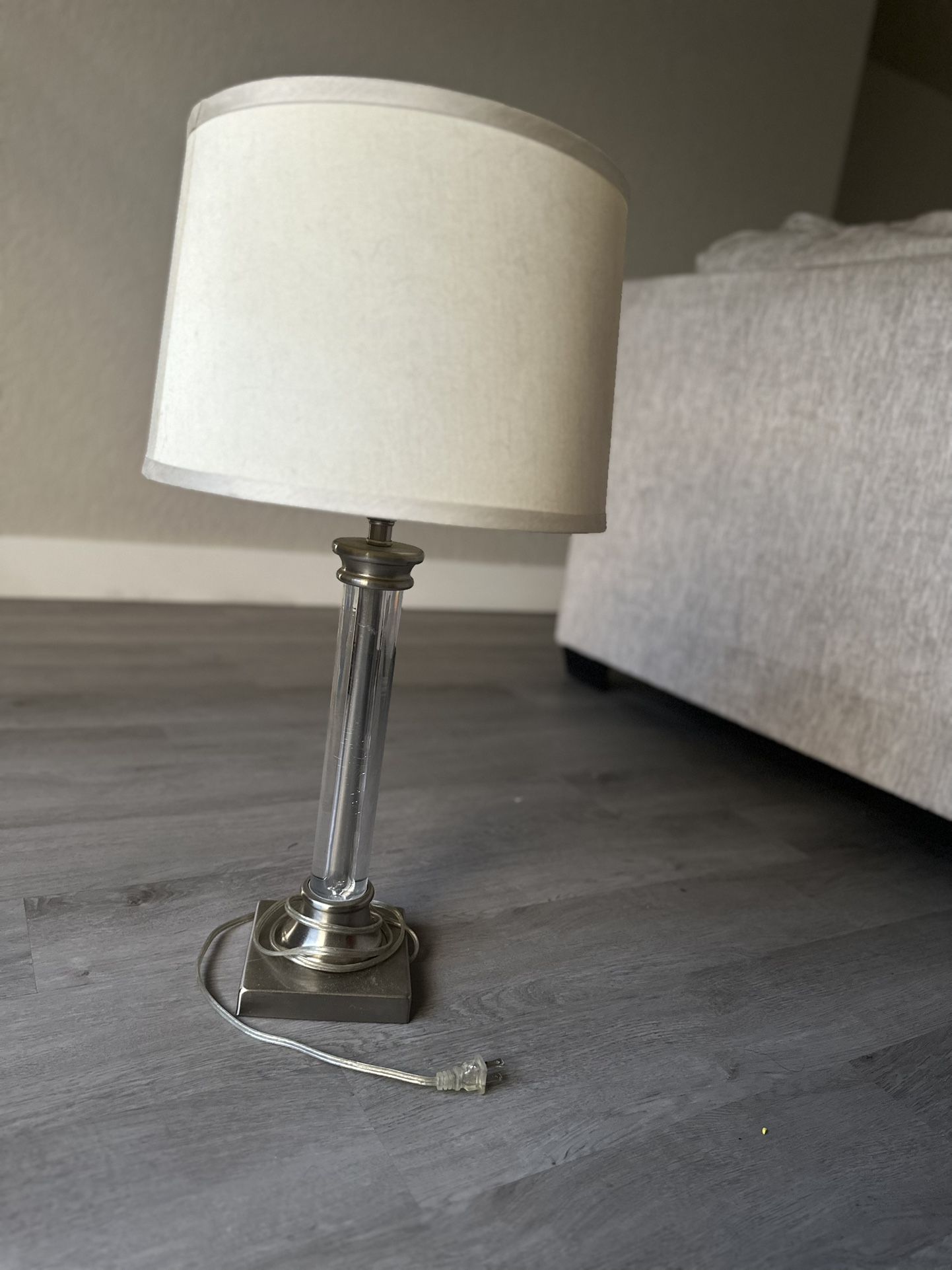 White and clear lamp with metal base About 2 feet tall, in working condition.