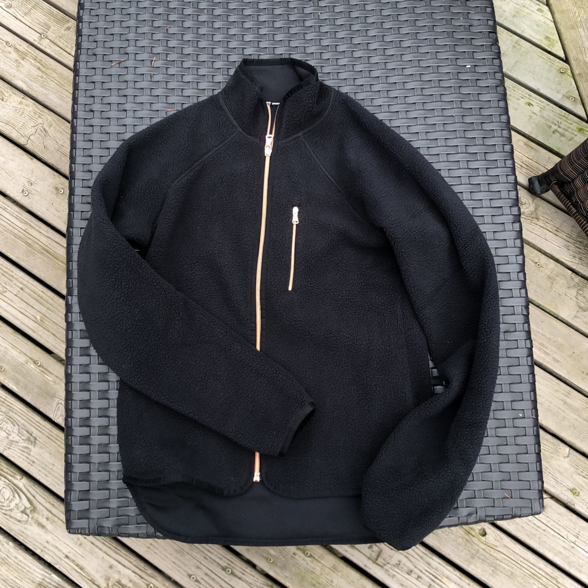 Black fleece jacket with thumb holes and copper zipper and accents.