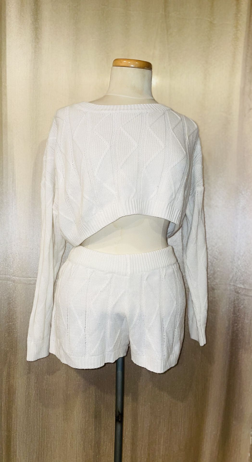Never been worn ivory crop sweater & matching shorts made by brand SHEIN, size small. 100% Acrylic. Machine wash with like colors. Measurements in photos. Please let me know if you have any questions thanks!