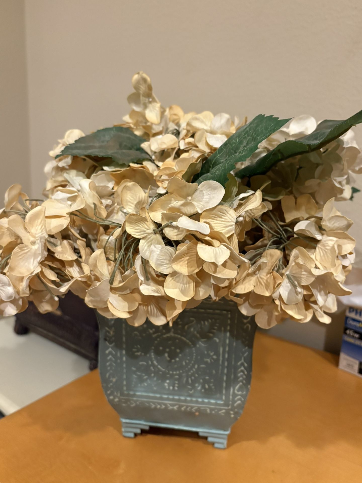 Beautiful Set of Floral Arrangements in a Calming Sea Green Metal Container. Set of Two. BOGO.