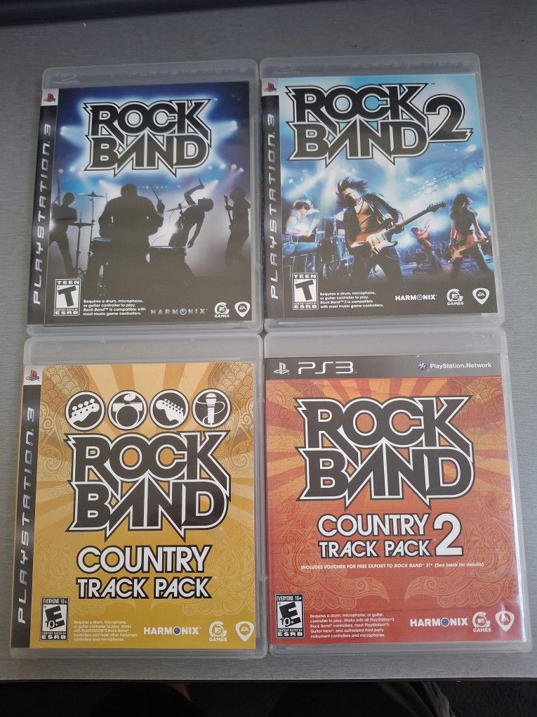 Rock Band 1, Rock Band 2, RB Country Track Pack 1 & RB Country Track Pack 2 video games for ps3. Black label, complete in box & all discs in perfect condition. Willing to sell separately. Please see other Playstation listings, multiple purchases = discount!