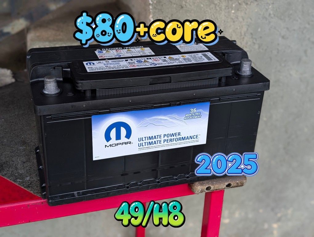 Car Battery Group Size 49/H8 2025 In excellent condition. Fully Tested. $80 with core exchange (old battery) or $95 without. You're welcome to bring your own tester, but I'll also provide one. Payment accepted via Cash or Zelle. Located in Boyle Heights.