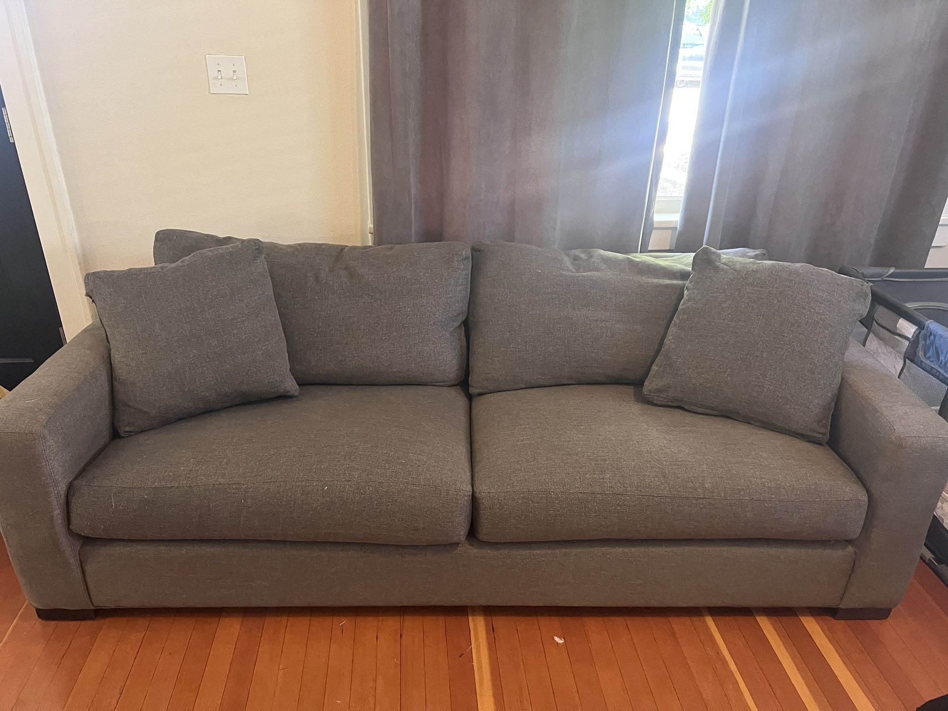 The most comfiest cuddle up feather couch ever! So sad to have to sell this couch but we are a family of 5 now and it just doesn’t fit all of us! The cushions are washable which is GREAT! I would keep it forever if i could but we need a bigger couch! The color is grey and comes with two pillows!