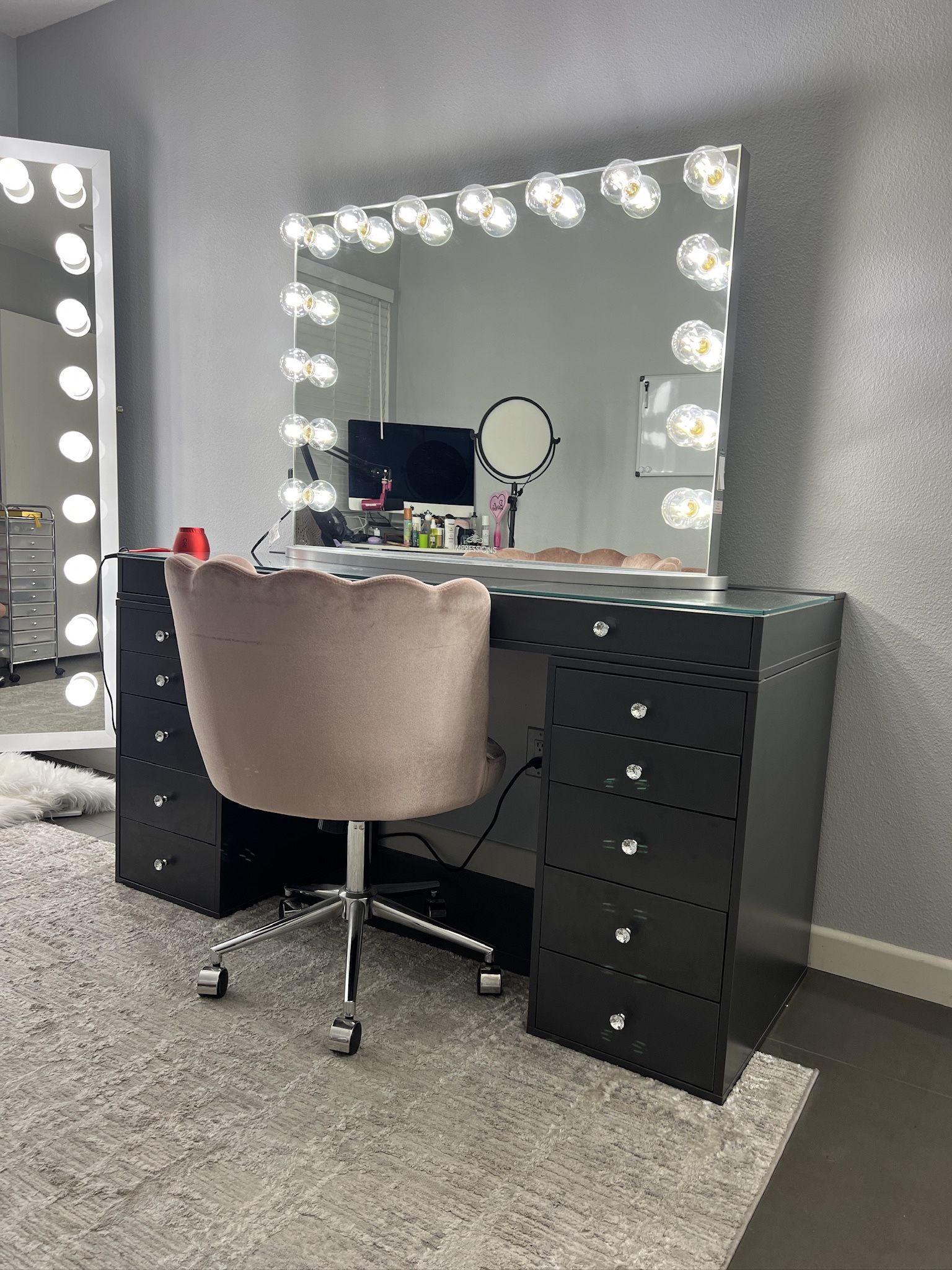 PRODUCT DETAILS: Impressions Vanity Hollywood Glow Lite Pro Vanity Mirror (Clear Bulbs & No Bluetooth) comes with mirror stand - Has two outlets for hairdryer/straightener Slaystation Pro in Charcoal grey, 5 drawer units with solid glass top. Plus a free pink chair, if you need it Description: Gently used and is about 2 years old. Everything works great, just selling to downsize. You will need multiple people to help load into car/truck - the glass top is heavy. MEASUREMENTS: Mirror Measurements: Mirror: 43.25 x 32.5 in Length: 45.75 in. Width: 12.75 in. Height: 32.5 in. Weight: 60lbs Tabletop: 59 inches & 80lbs