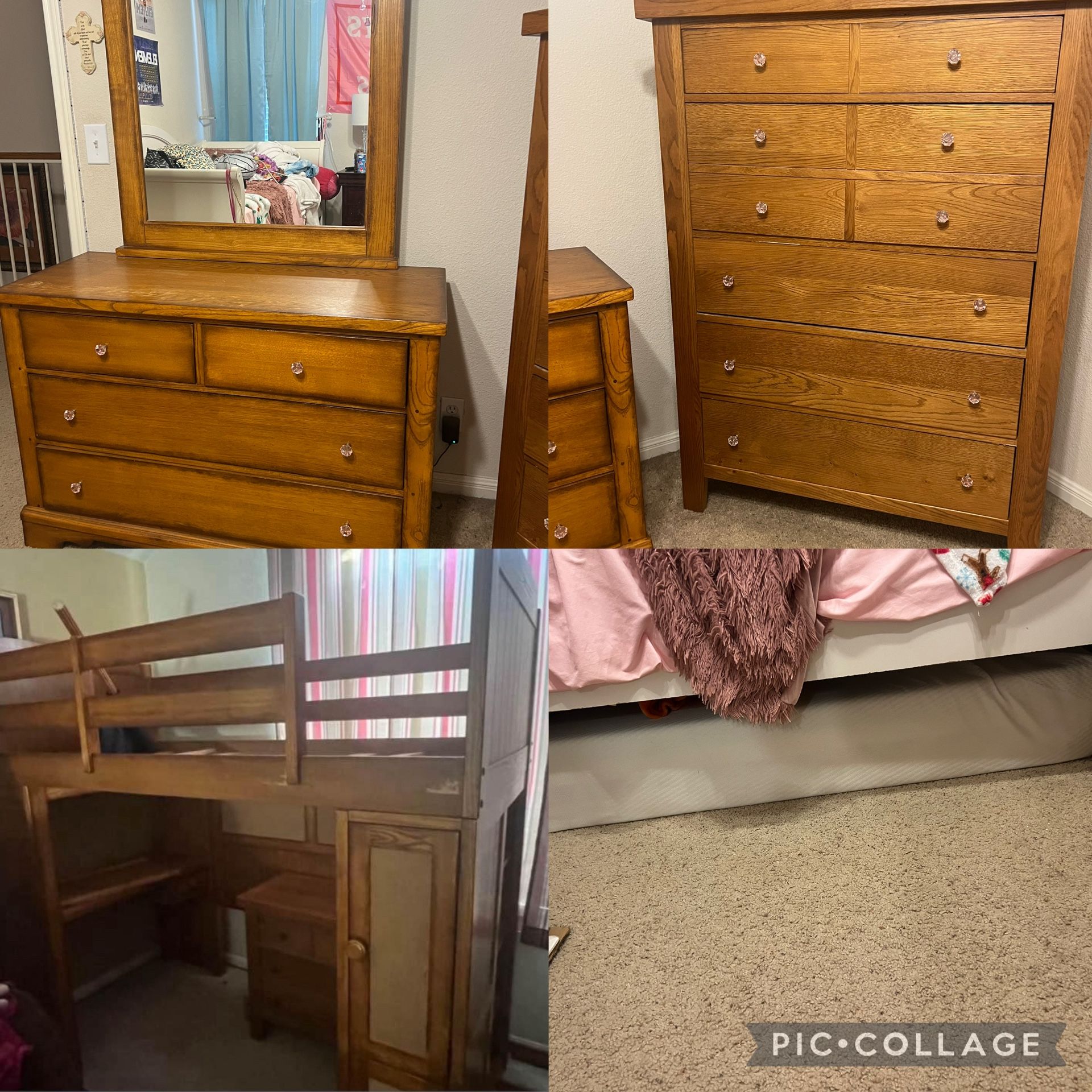 Would really love to sell as a set it’s a great set. Has minor wear and tear but overall still in amazing condition. Loft bed, built in desk, cabinets drawers, cork board, bookshelf, ladder, plus a twin mattress. Enough room under the loft bed to attach another twin bed frame under or make a secret hide out for your gamer ☺️ Long dresser with mirror. All drawers are functional and work great no issues. Tall dresser/chest all drawers do open and close but are slightly off track just a little most likely a really simple fix. Asking $200 obo for the entire set. Really need to find a new home asap for it so please only serious buyers! ☺️ Porch pick up! Can deliver as well if you are in Georgetown, TX if that helps as well.