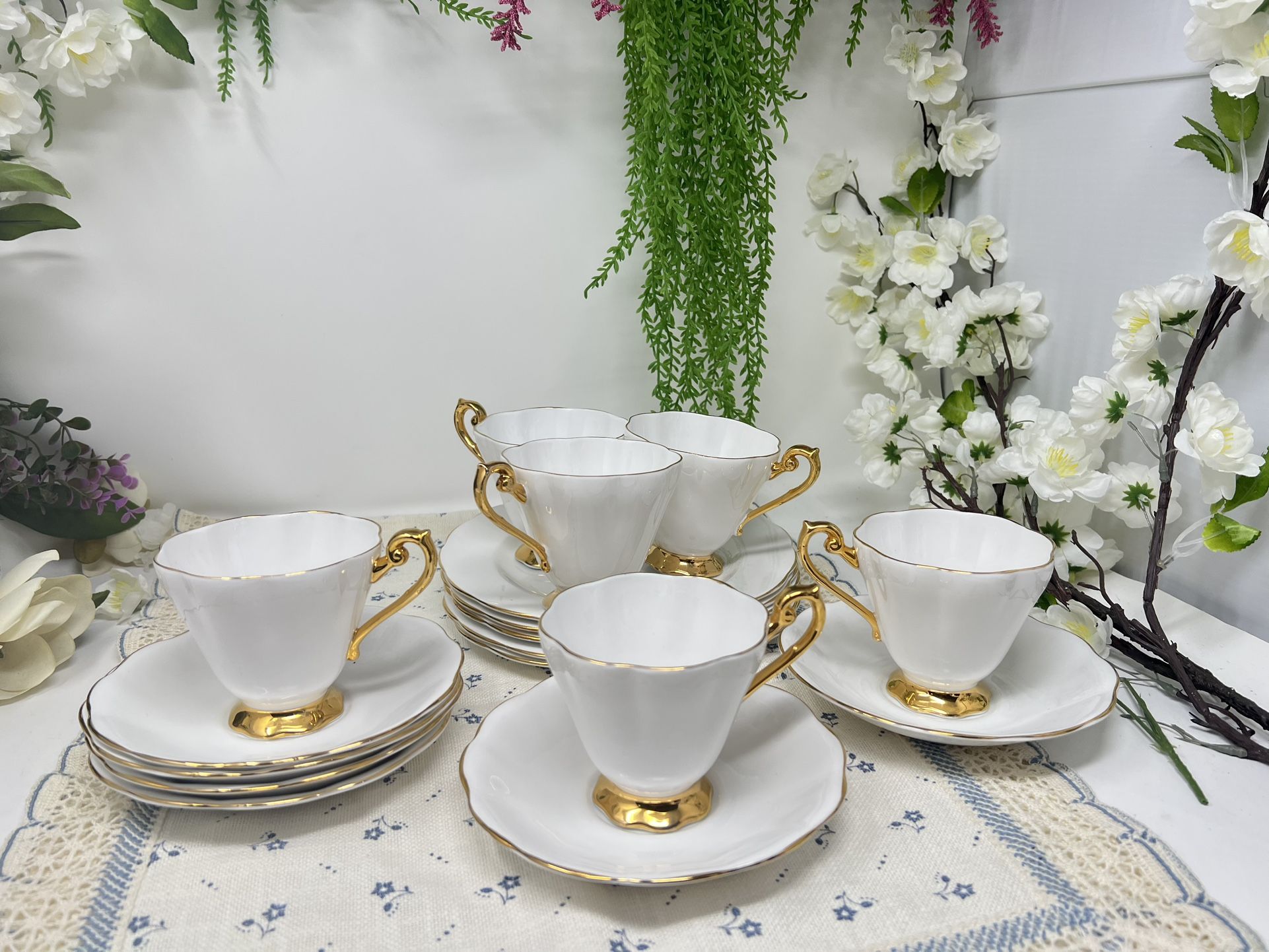 6 footed teacups + 6 saucers + 5 dessert plates Fine bone china, bold gold trim Excellent vintage condition – no chips or cracks