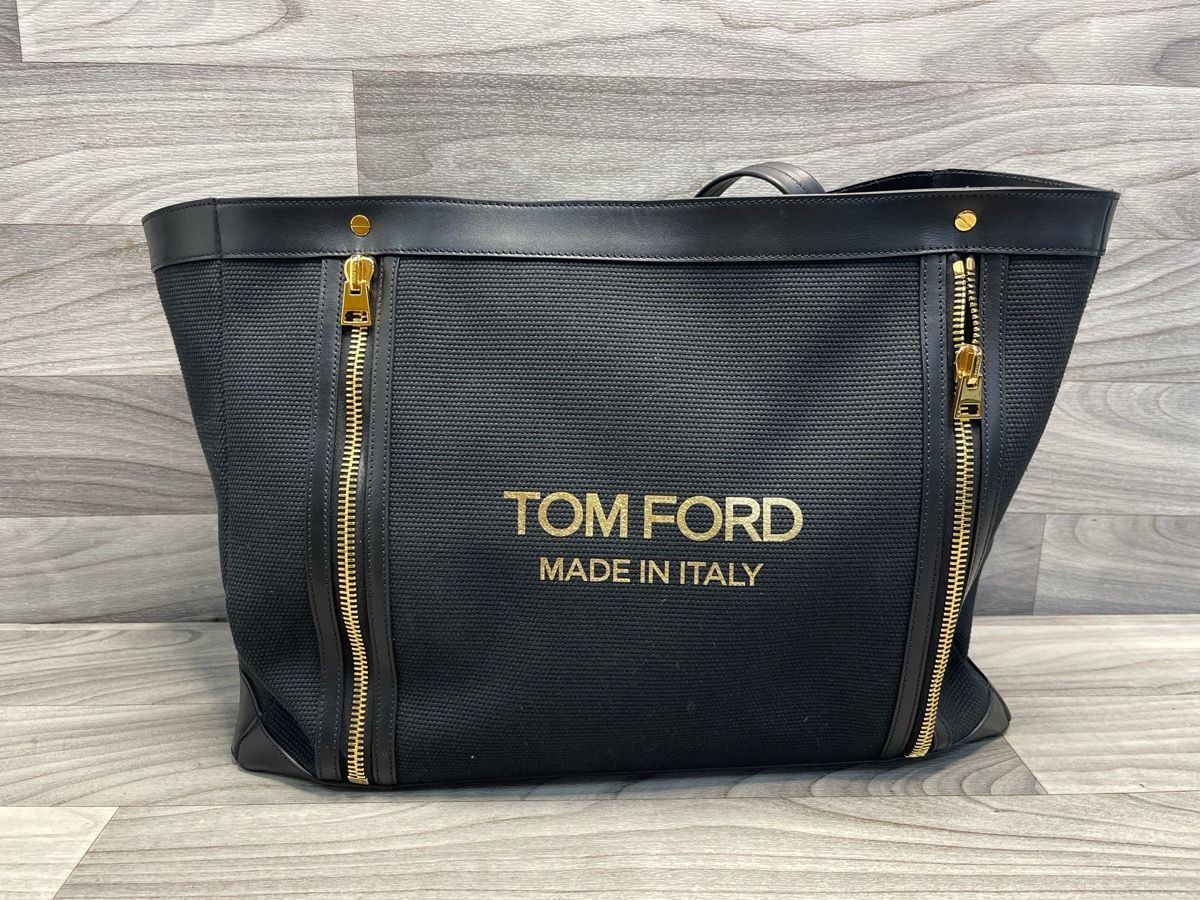Tom Ford Textured Canvas Screw Tote Bag Black with Leather Trim 12"x18". Crafted in Italy, this luxury tote features durable textured canvas construction accented by smooth black leather trim and gold-tone screw hardware. The spacious open-top design includes dual rolled leather handles and a soft fabric interior with slip pockets for organization. Measuring approximately 12 inches tall and 18 inches wide, it’s ideal for travel, shopping, or daily use. The bag shows very light cosmetic wear consistent with careful use—no major marks or damage. Interior is clean and retains structure. Elegant “TOM FORD MADE IN ITALY” gold logo on the front and heavy-duty zippers along each side highlight its premium craftsmanship. A-1 Hawk Open 7 days a week 10am-6pm 12314 SE Division St Portland OR 97236 503-760-0700 Mention this ad :)