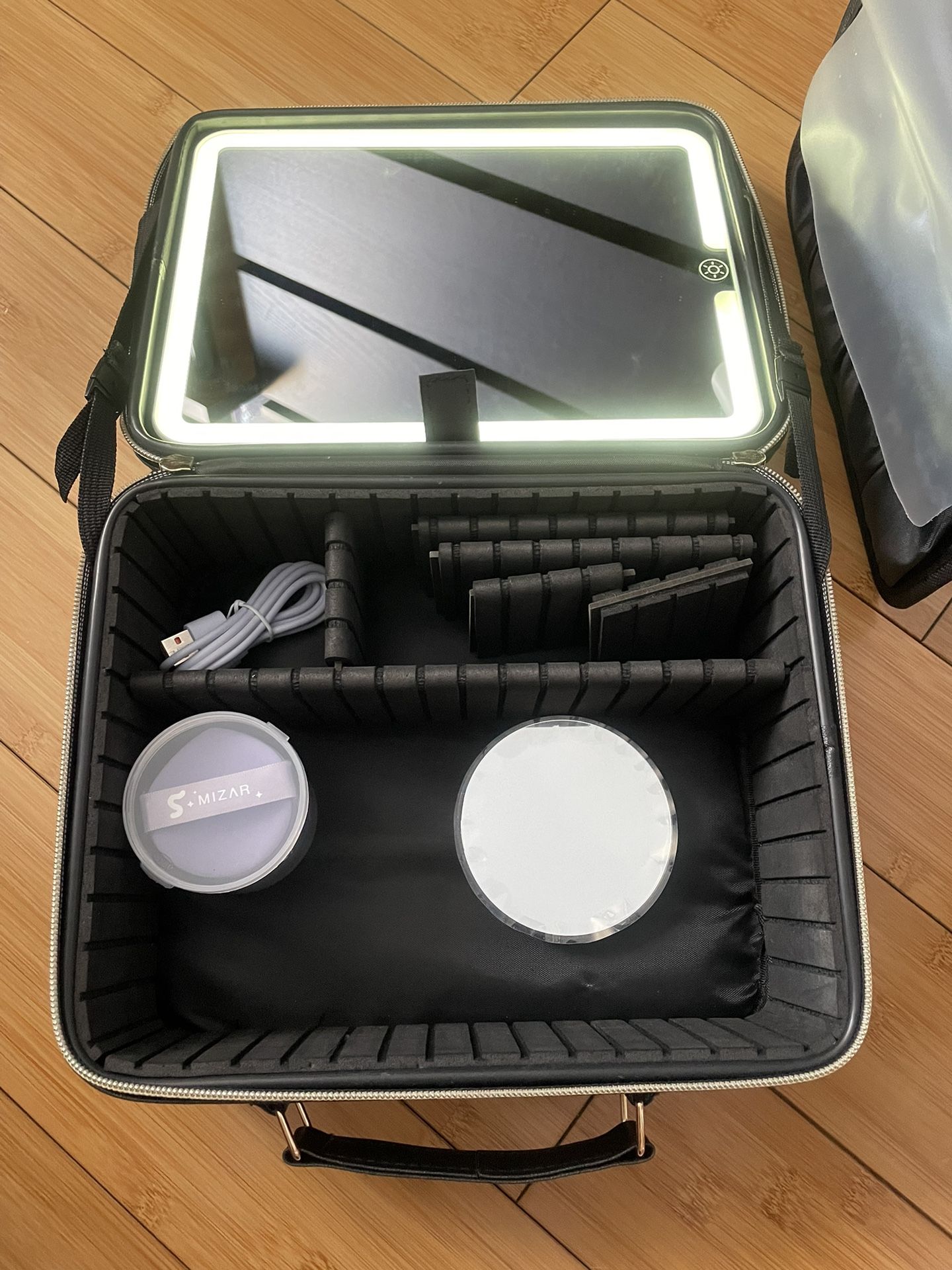 Durable travel makeup case •Premium PMU leather •Waterproof and durable material •Convenient for traveling •Smart adjustable mirror with 3 light settings •5x magnifying mirror attachment •Adjustable dividers •Brush bag •Makeup puffs •Charging cable Case size: 10.43”L x 9.05”W x 4.72”H Brush bag size: 9.21”L x 7.12”H Purchased for $50 Condition: new **Must pick up in Chandler area** No trades