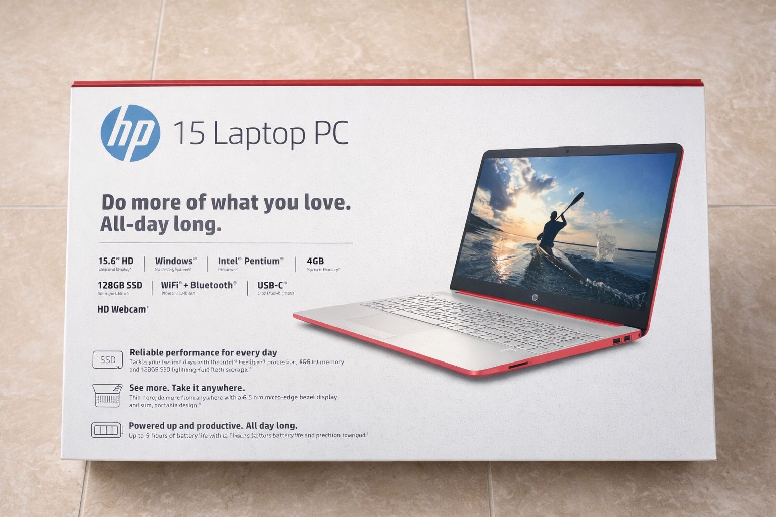 HP 15.6” Laptop – Pentium, 4GB RAM, 128GB SSD (Scarlet Red)