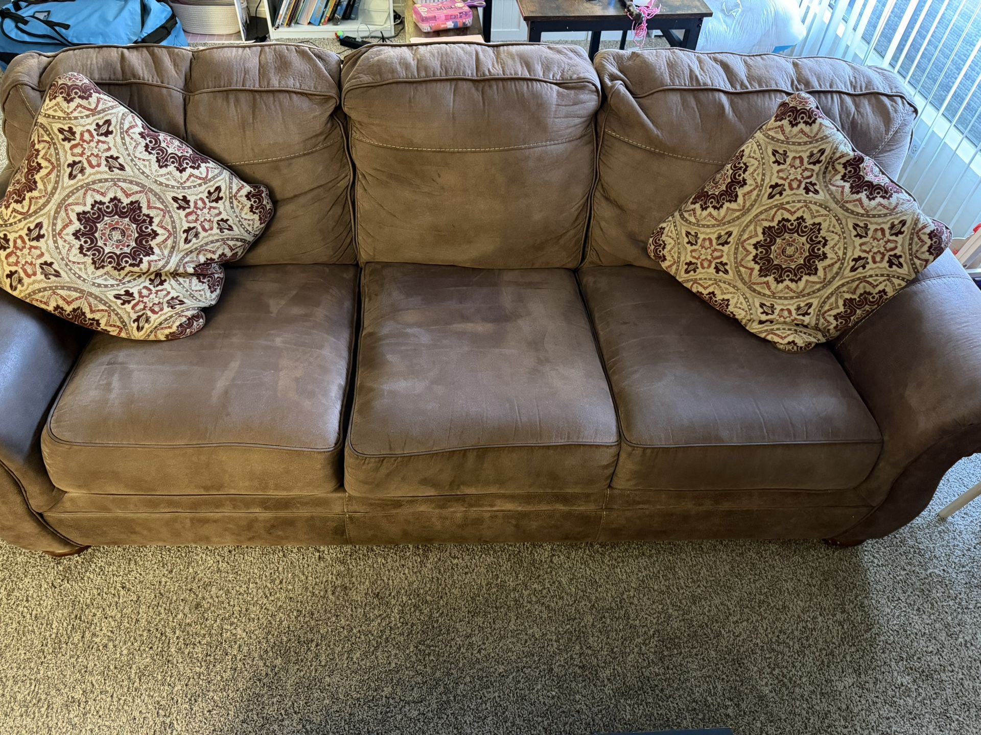 Giving away our well-loved living room set. About 10 years old and definitely shows signs of a full, happy life. Still super comfortable, sturdy, and cozy. Perfect for a family room, playroom, bonus room, or anyone who wants comfort over perfection. Dimensions: • Couch: 88 inches long × 38 inches deep × 3 feet tall • Chair: 44 inches wide × 38 inches deep × 3 feet tall • Ottoman: 24 inches across × 20 inches deep × 17 inches high Neutral brown tone goes with lots of decor. Comes from a smoke-free and pet free home.