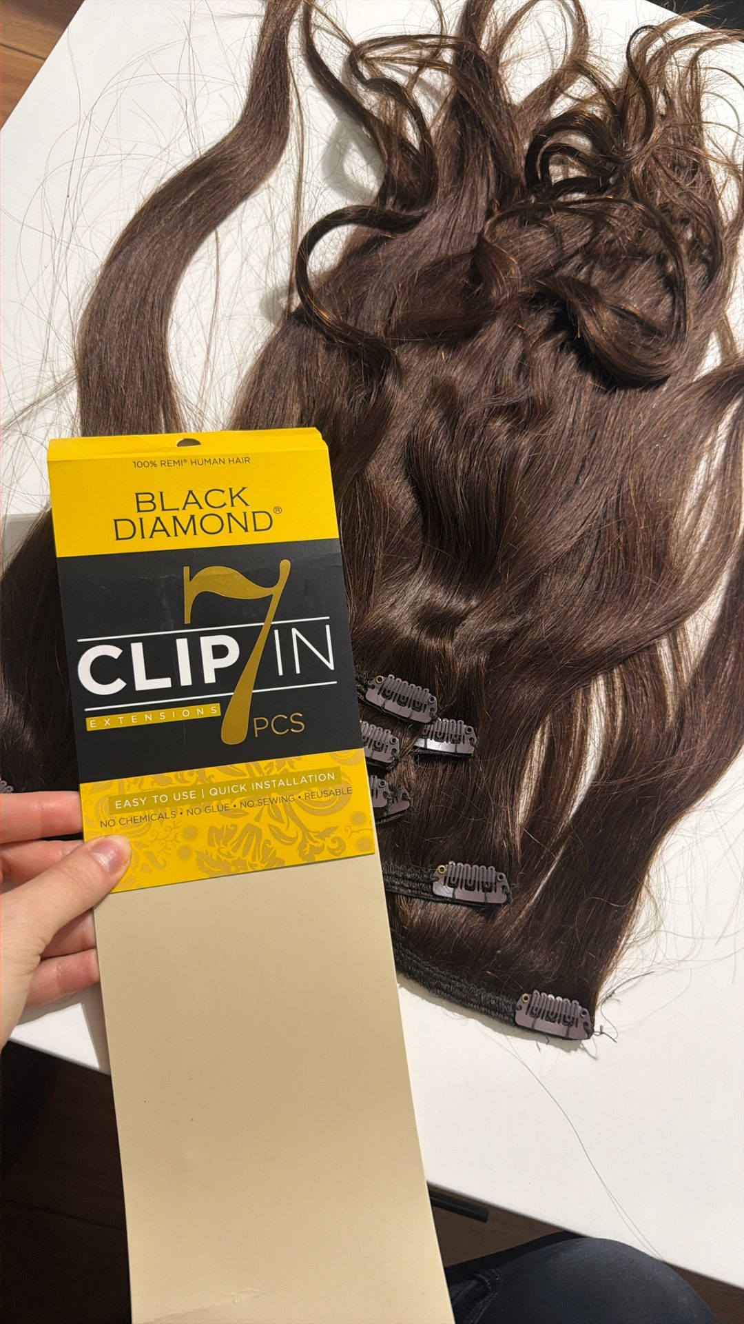 Black diamond Hair extensions Clip on 7 pieces 100% Real remyi human hair No glue no chemicals no sewing reusable 18’’ color 4 chocolate brown Original price is 189