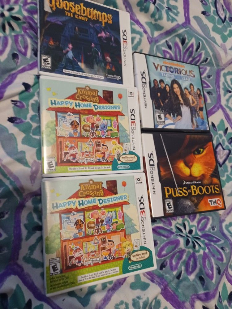 We have a lot of 5 games for Nintendo 3DS. Animal crossing is 1 lightly used and 1 new open box. Goosebumps, puss in boots, and victorious are all lightly used and all in working condition. 20 for new Animal crossing, 15 for used Animal crossing, 15 for goosebumps, and 5 each for other 2.