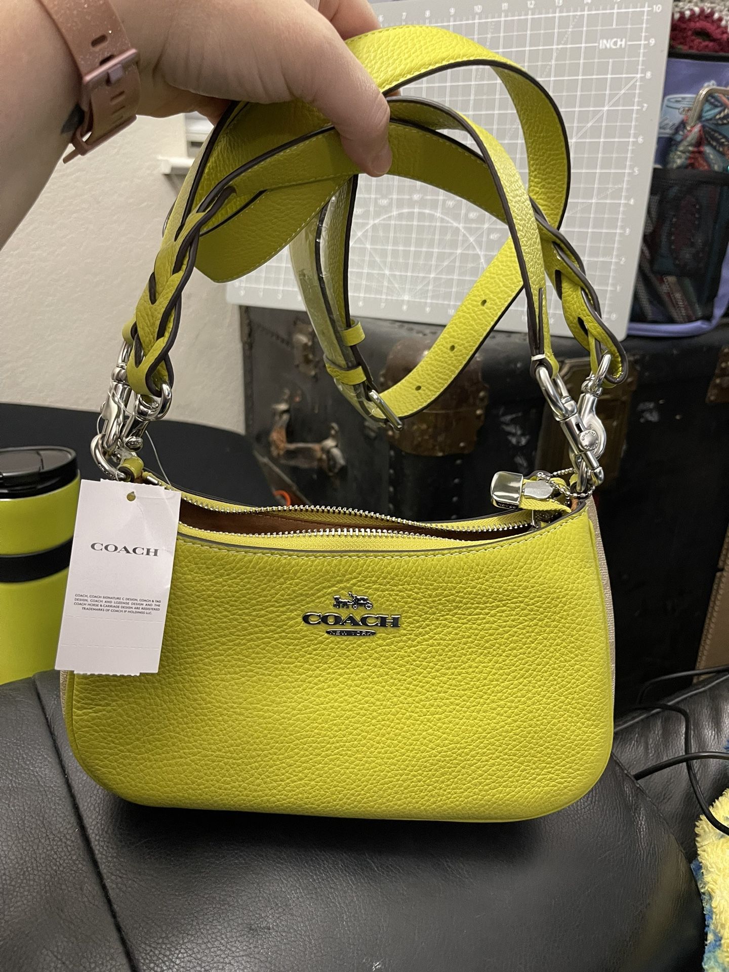 New Coach Teri Shoulder Crossbody Bag Khaki Signature Canvas Key Like Leather!