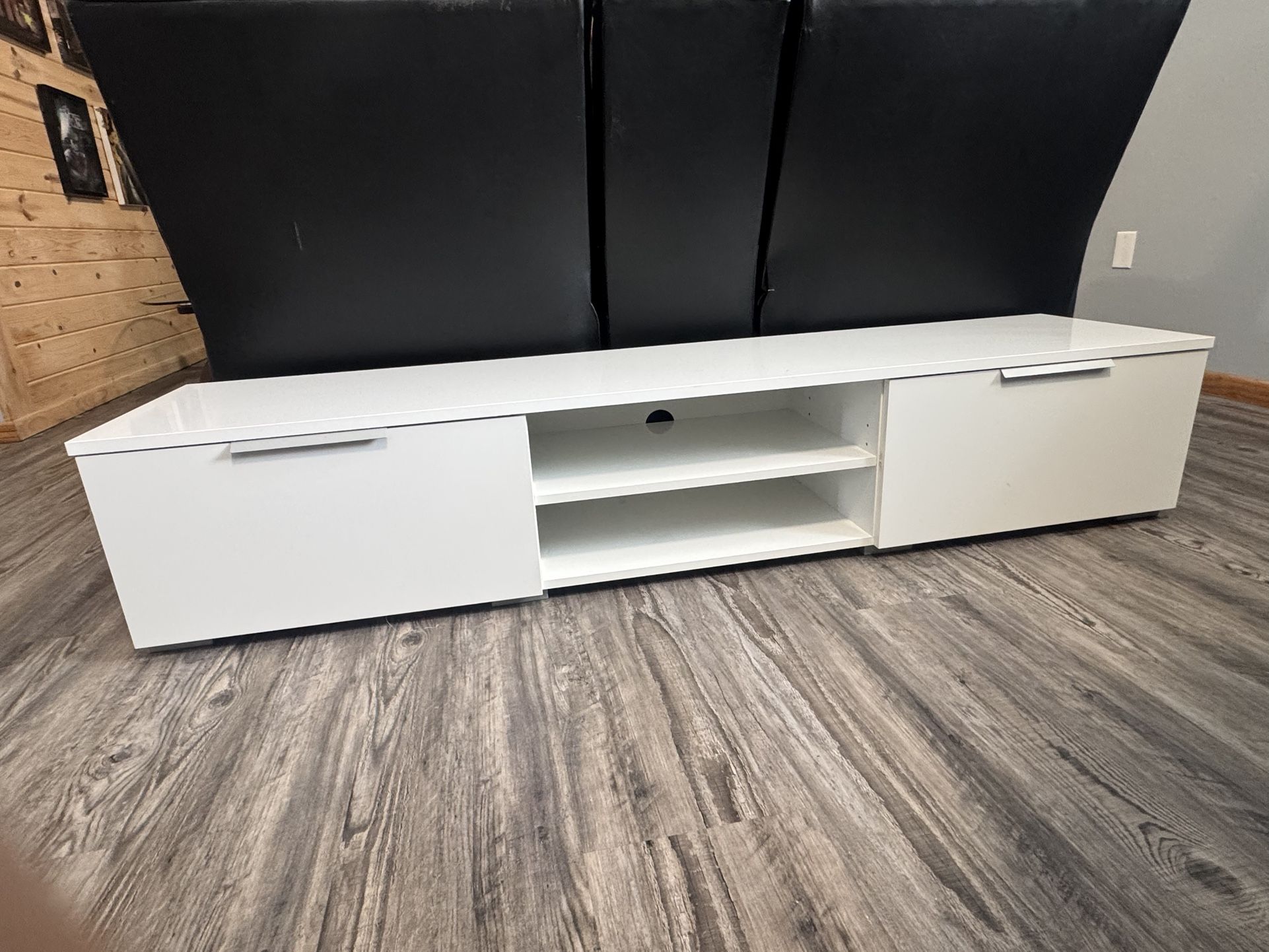 Modern white TV stand in good condition. Clean design with storage space, perfect for living room or bedroom setup. Dimensions: 68” W x 13” H x 15 1/2” D