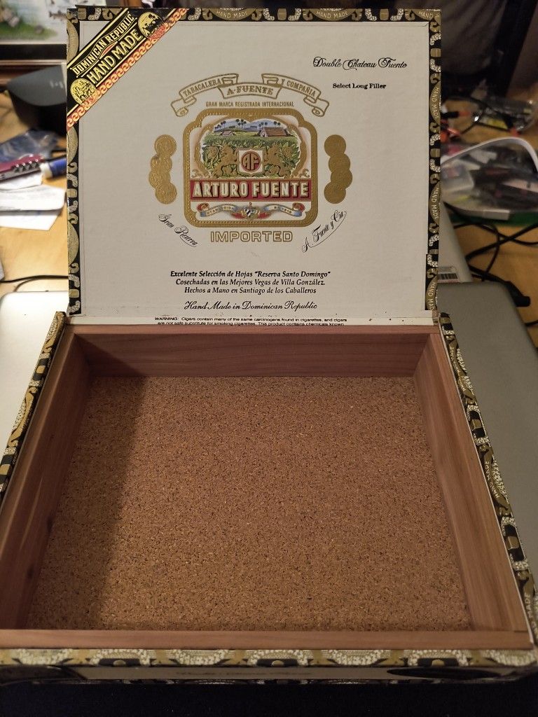 Aromatic cedar and cork lined storage box using empty vintage cigar box. Great for your collection of fishing flies or other small collectibles.