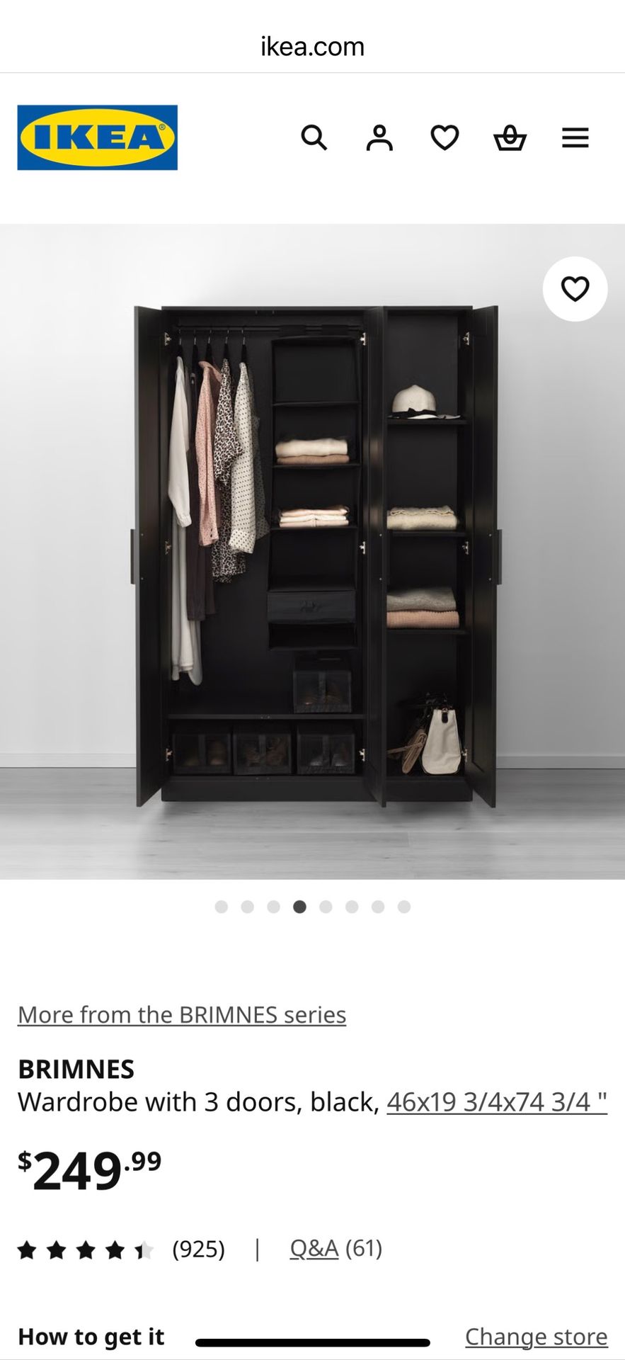 Ikea armoire, black, see photo for dimensions. Needs to be assembled (too heavy and bulky to transport in one piece for most people). Simple to put together, but if needed, directions online on ikea website. CLICK ON PHOTOS FOR BETTER VIEW