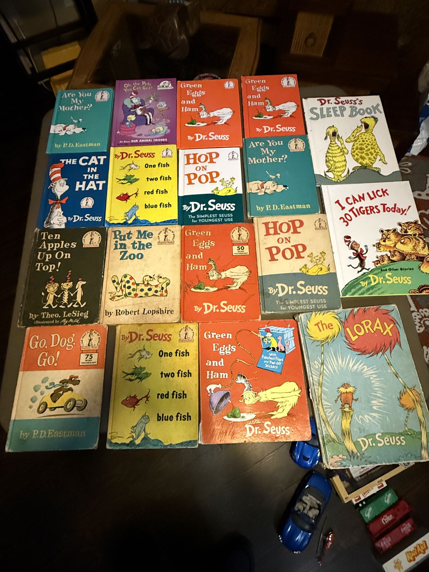 Collection of vintage Dr. Seuss books Including Are you my mother? The cat in the hat 10 apples up on top Go dog go One fish, two fish, red fish, blue fish Put me in the zoo Newer version of one fish, two fish, red fish, blue fish Oh, the pets you can get Green eggs and ham Hop on pop Green eggs and ham Green eggs and ham with fabulous flaps, and stickers The Lorax I can lick 30 tigers today Sleep book Hop on pop Are you my mother? Green eggs and ham Most of these are quite old and in various conditions, a couple have names inside Looking for $50 for the collection OBO if interested