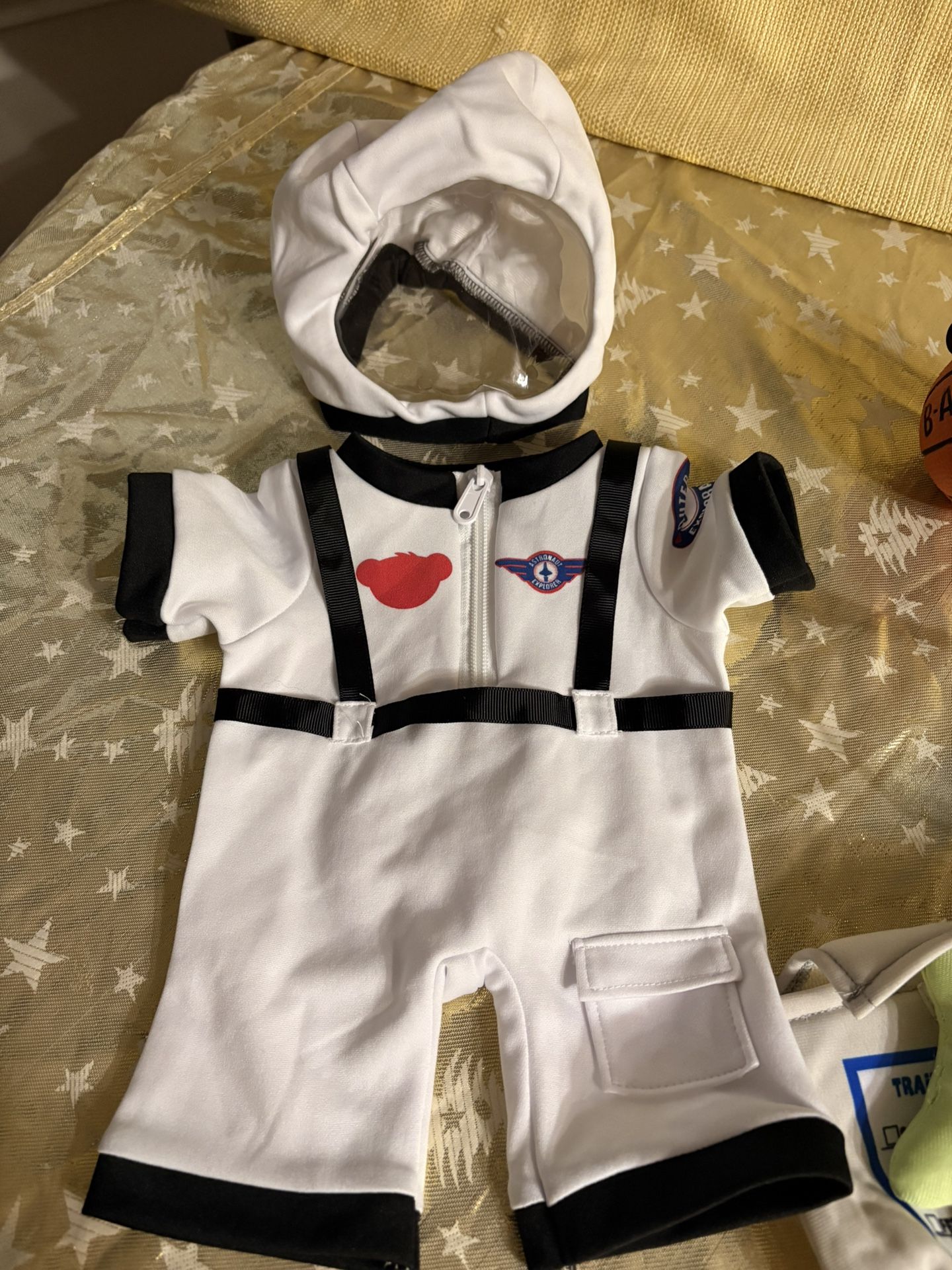 Build a Bear Clothing and Accessories. Included is a white and black space suit with black high top sneakers. There are three shirts, a red and gold stripe scarf and Bear puppy accessories to include a basketball. Pet free and smoke free home. Cash or Venmo accepted.
