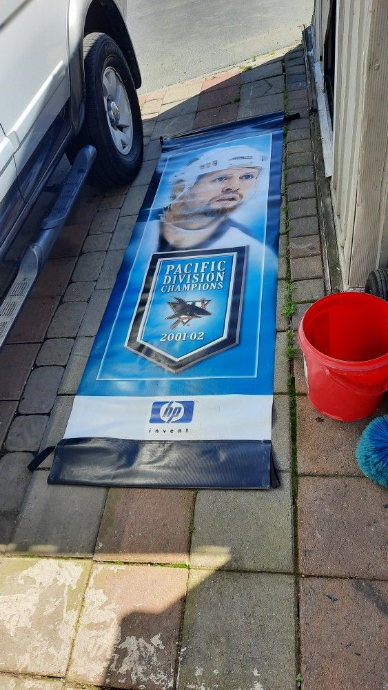8ft x 2.5ft no rips great colors.double sided.1st championship run. Personal gift from VP of marketing operations at the time.Not a public sale https://offerup.co/faYXKzQFnY?$deeplink_path=/redirect/ of a limited quanity that hung from light poles in the city that any collector or Sharks fan would love.Make me a offer!I'll deliver if possible...Waterproof vinyl .