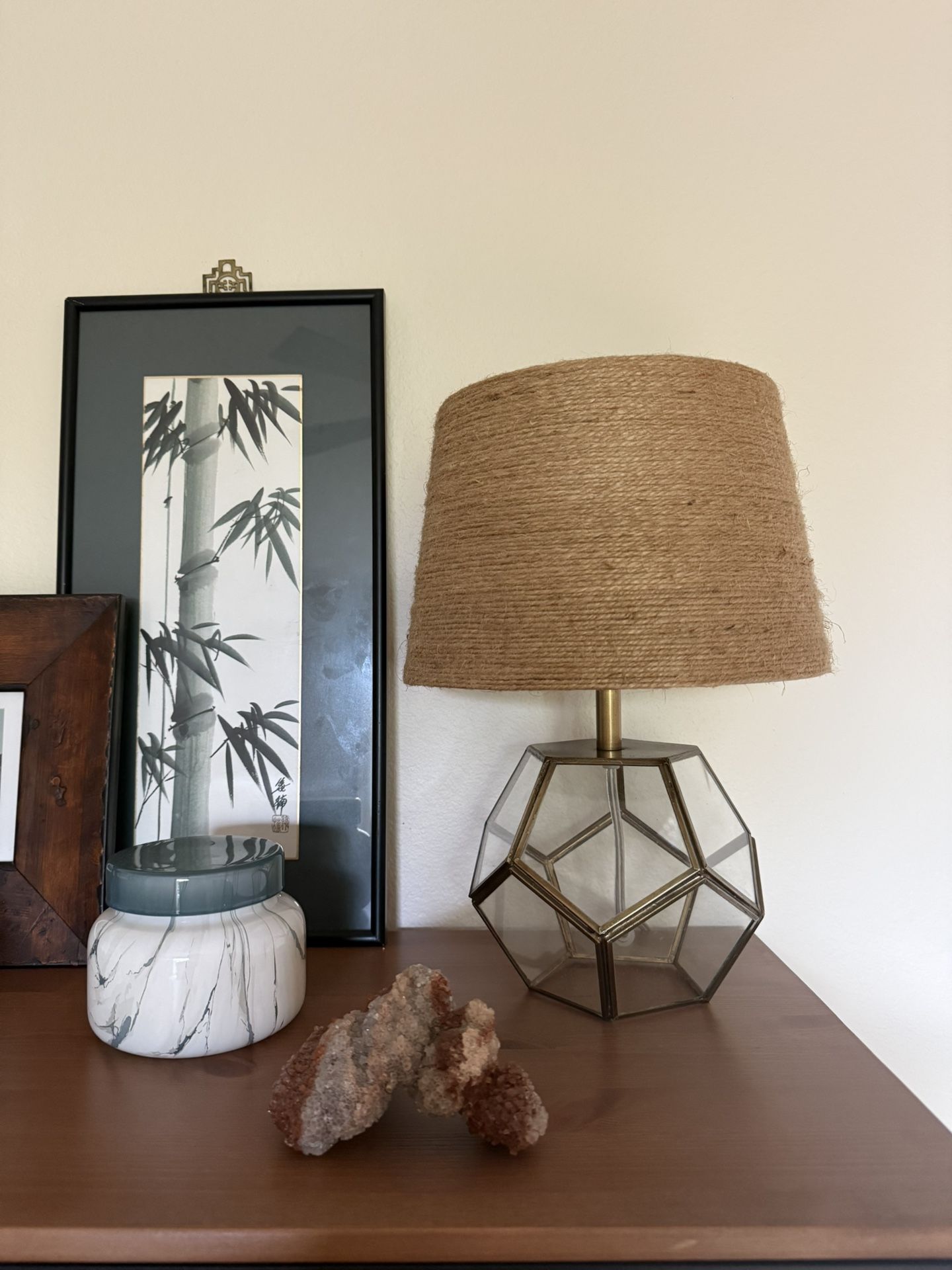Glass and Bronze pentagon patterned base. Tweed lamp shade On/Off switch located on cord 6.75in Dia. X 10in H without shade 10in Dia. X 14in H with shade